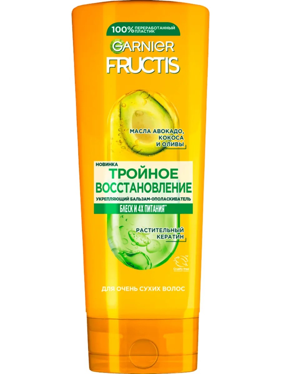 СУХИЕ, ЛОМКИЕ ВОЛОСЫ? Fructis (Фруктис) от Garnier (Гарньер) представляет укрепляющую систему, которая совмещает в себе суперфрукт натурального происхождения с активными ингредиентами. Ваши волосы выглядят более здоровыми и сильными. Бальзам-Ополаскиватель Тройное Восстановление обогащен суперингредиентами: 3 Маслами: авокадо, кокоса и оливы, а также питательными липидами для восстановления, придания блеска и смягчения волос без утяжеления.