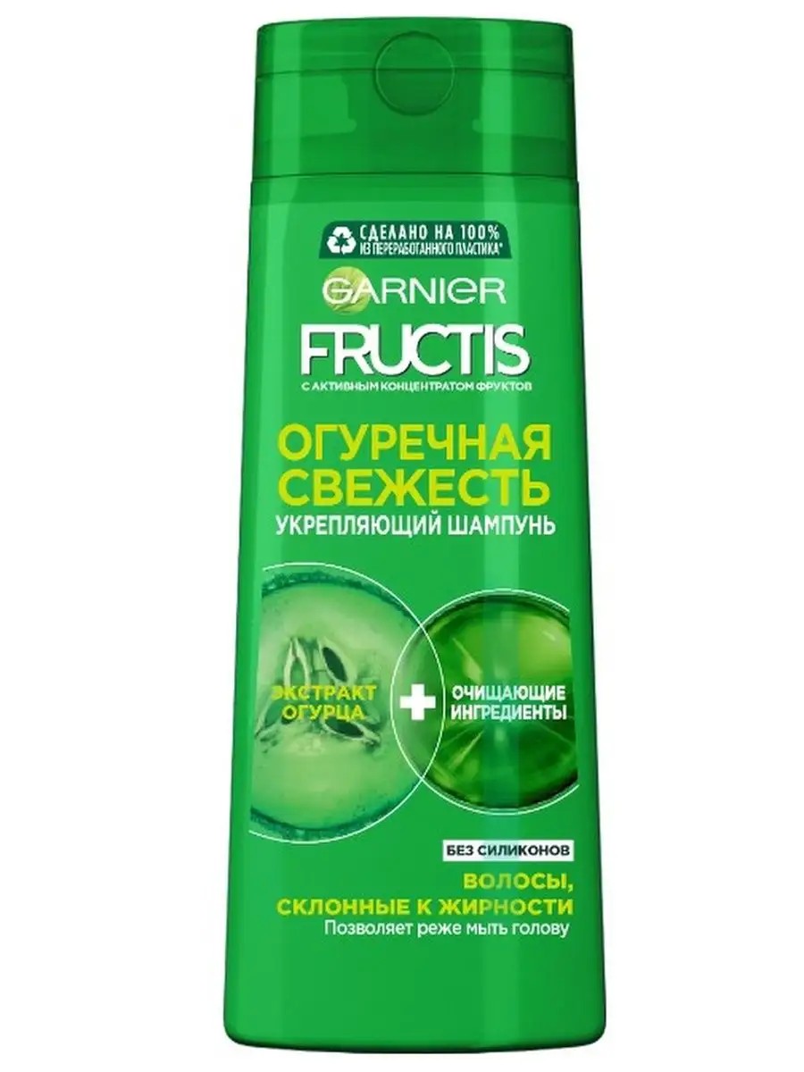 Гарнер fructis огуречная свежесть укрепляющий шампунь 400 мл. Шампунь, продлевающий свежесть волос. Специально создан для волос, склонных к жирности и быстрому загрязнению. Благодаря уникальной комбинации экстракта огурца и витаминов B3 и B6 шампунь надолго очищает волосы и кожу головы, способствует укреплению волосяных луковиц и росту более сильных волос. Активный концентрат фруктов в составе обеспечивает антиоксидантную защиту, делает волосы плотными и блестящими.