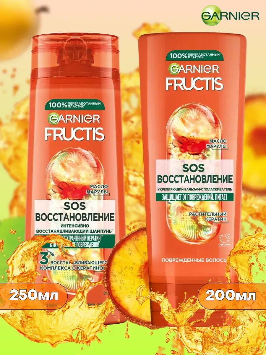Набор Garnier Fructis Шампунь и Бальзам для волос представляет систему восстановления волос, которая совмещает в себе суперфрукт натурального происхождения с активными ингредиентами. Шампунь SOS Восстановление фрутис обогащен двумя суперингредиентами: Формула с маслом амлы и кератином питает и укрепляет поверхность волос по всей длине, а также восстанавливает повреждения волос, вызванные внешними воздействиями (сушка феном, тепловая укладка). Доказано! Устраняет 1 год повреждений за 3 применения. Волосы выглядят более здоровыми, шелковистыми и блестящими.Женский Шампунь для волос + Ополаскиватель-бальзам, обеспечивает увлажнение и защиту от повреждений, а также способствует росту и густоте волос, придавая объем. Этот мультифункциональный шампунь гарнер, предназначенный для ежедневного применения, содержит компоненты, которые помогают восстанавливать и укреплять волосы, а также предотвращать их выпадение. Бальзам фрутисс для головы, содержащий увлажняющие компоненты, питает и очищает волосы, предотвращая сухость и повреждения. Этот универсальный бальзам фрути - ополаскиватель, подходящий для женщин и мужчин, также помогает увеличить объем и густоту волос, а также стимулирует их рост. Уходовый, очищающий и косметический набор 2шт. для ваших тусклых или сухих волос, от Фруктис Гарниер с заботой о вас. Бальзам увлажняющий фруттис гарньер- против выпадения волос и шампунь против перхоти, для очищения кожи головы.