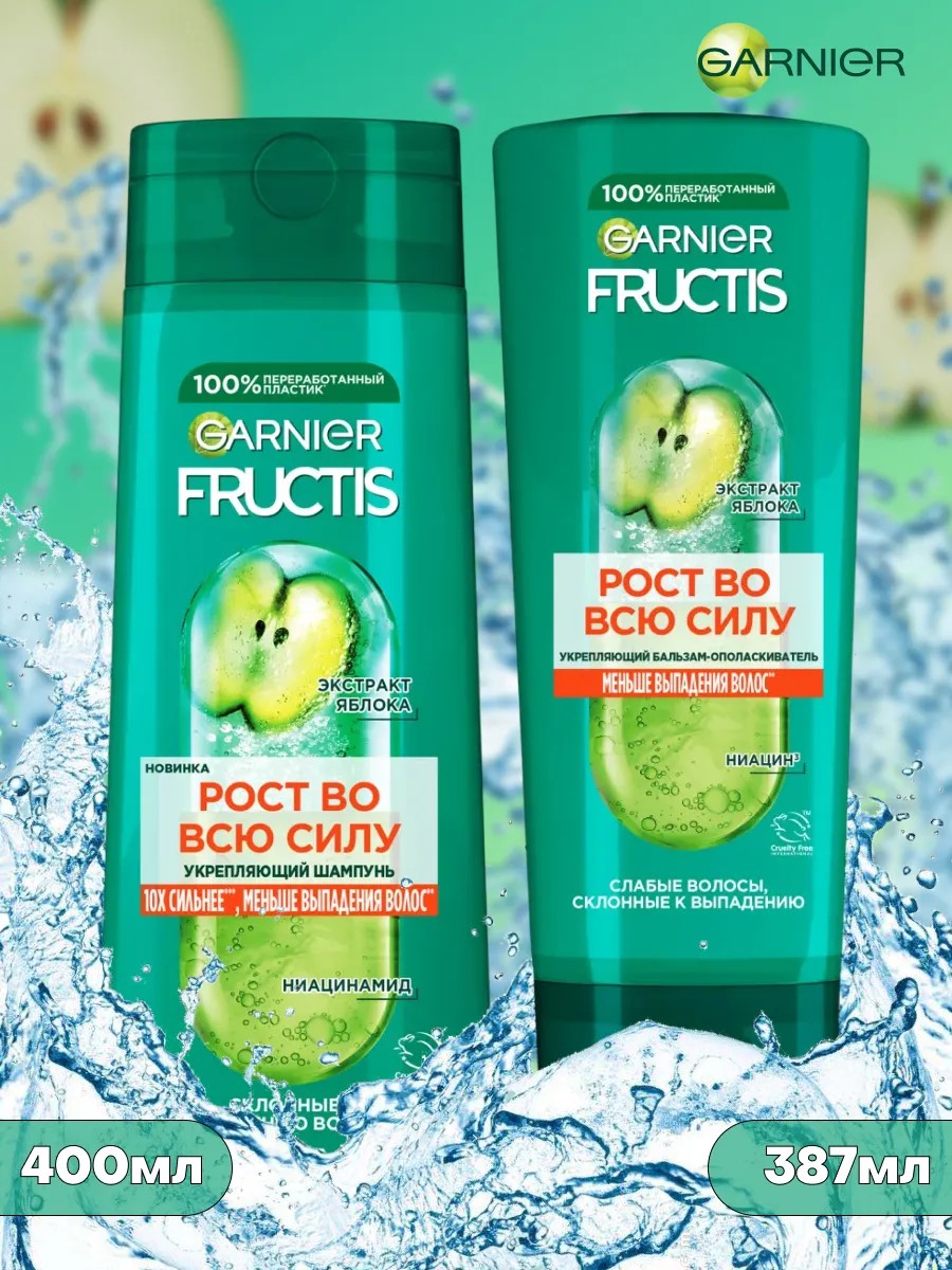Подарочный набор Шампунь и Бальзам от Fructis Garnier. шампунь и бальзам для волос представляет систему усиления, которая сочетает в себе суперфрукт натурального происхождения с активными ингредиентами. Ваши волосы выглядят более здоровыми и сильными после шампуня garnier фруктис. Шампунь гарньер фрутис Рост Во Всю Силу обогащен двумя суперингредиентами: Экстрактом яблока и Ниацином, для придания волосам жизненной силы, сияния и восстановлении прочности волос. Доказано! Волосы становятся более прочными, стойкими и сияющими от корней до кончиков. Fructis (Фруктис) от Garnier (Гарньер) представляет систему усиления, которая сочетает в себе суперфрукт натурального происхождения с активными ингредиентами. Ваши волосы выглядят более здоровыми и сильными. Бальзам-ополаскиватель Рост Во Всю Силу обогащен двумя суперингредиентами: Экстрактом яблока и Ниацином, для придания волосам жизненной силы, сияния и восстановлении прочности волос. Доказано! Волосы становятся более прочными, стойкими и сияющими от корней до кончиков. Женский Шампунь для волос + Ополаскиватель-бальзам, обеспечивает увлажнение и защиту от повреждений, а также способствует росту и густоте волос, придавая объем. Этот мультифункциональный шампунь гарнер, предназначенный для ежедневного применения, содержит компоненты, которые помогают восстанавливать и укреплять волосы, а также предотвращать их выпадение. Бальзам фрутисс, содержащий увлажняющие компоненты, питает волосы, предотвращая сухость и повреждения. Этот универсальный бальзам фрути - ополаскиватель, подходящий для женщин и мужчин, также помогает увеличить объем и густоту волос, а также стимулирует их рост. Уходовый, очищающий и косметический набор 2шт. для ваших тусклых или сухих волос, от Фруктис Гарниер с заботой о вас. Бальзам увлажняющий фруттис гарньер- против выпадения волос и шампунь против перхоти, для очищения кожи головы. Ежедневный и выгодный набор-комплект garnier fructis для ухода за волосами.