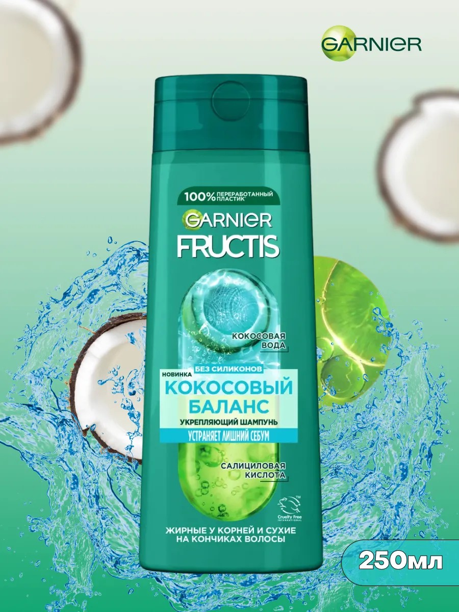 Уникальная формула женского шампуня для волос garnier fructis (гарнер фруктис) кокосовый баланс без силиконов, обогащенная кокосовой водой и витаминами в3 и в6, очищает у корней и увлажняет до самых кончиков от garnier (гарньер фрутис). Волосы мягкие и гладкие. Результат применения шампуня для ослабленных волос: свежие у корней и увлаженные волосы по всей длине. Новая формула fructis не содержит парабенов и обогащена активным концентратом фруктов. Благодаря комбинации фруктов, витаминов в3, в6 и протеина лимона ваши волосы более сильные и блестящие. Способ применения увлажняющего шампуня фрути: нанесите на влажные волосы шампунь против выпадения фрутисс, распределите по всей голове массирующими движениями, затем смойте. В случае попадания очищающего средства в глаза немедленно промойте водой. Забудьте о тусклых волосах и секущихся кончиков с шампунем для поврежденных волос, для ежедневного ухода за объемом ваших волос!