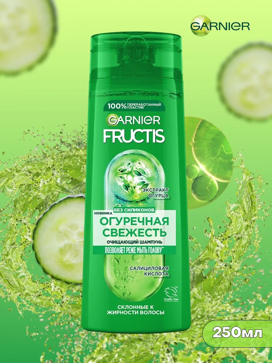 GARNIER FRUCTIS Cucumber Freshness Women's Shampoo prolongs the life and freshness of hair. Specially formulated for hair prone to oiliness and rapid greasiness. Thanks to a unique combination of cucumber extract and vitamins B3 and B6, it cleanses the hair and scalp for a long time, helps strengthen hair follicles and promote the growth of stronger hair from Garnier (Garnier Frutis). The active fruit concentrate in the formula provides antioxidant protection, makes hair thick and shiny.