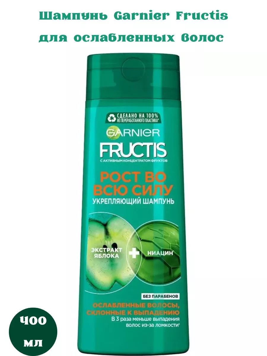 Слабые, хрупкие, очень ломкие и тонкие волосы? Garnier Fructis представляет систему укрепления, которая сочетает в себе яблочный экстракт натурального происхождения с активными ингредиентами. Укрепляющий шампунь для волос «Рост Во Всю Силу» предназначен для бережного очищения, делает волосы заметно более здоровыми и сильными, обеспечивает питание и восстановление, придает гладкость и блеск по всей длине. Керамид и экстракт яблока укрепляют и защищают волосы. Витамины B3 (ниацин*) и B6 восстанавливают повреждения, обеспечивают питание волосяных луковиц. Волосы становятся более сильными, в 3 раза более устойчивыми к выпадению из-за ломкости**. Шампунь способствует глубокому очищению кожи головы, оказывает отшелушивающее действие. Экстракт яблока обладает питательными свойствами, помогает сохранить здоровый вид, густоту и красоту волос. Экстракт лимона обеспечивает интенсивный укрепляющий и восстанавливающий эффект. Благодаря фруктовой формуле волосы каждый день выглядят более здоровыми, густыми и сильными, становятся прочными и блестящими от корней до самых кончиков. Женский, мужской, подростковый шампунь предназначен для ухода за ослабленными и склонными к выпадению волосами и кожей головы всех типов, включая жирную, нормальную и сухую. Способ применения: нанесите на влажные волосы, распределите по всей голове массирующими движениями, затем смойте. Шампунь подходит для ежедневного применения женщинами, мужчинами и подростками (мальчиками и девочками) с темными и светлыми, окрашенными и натуральными, длинными и короткими, прямыми и вьющимися волосами.