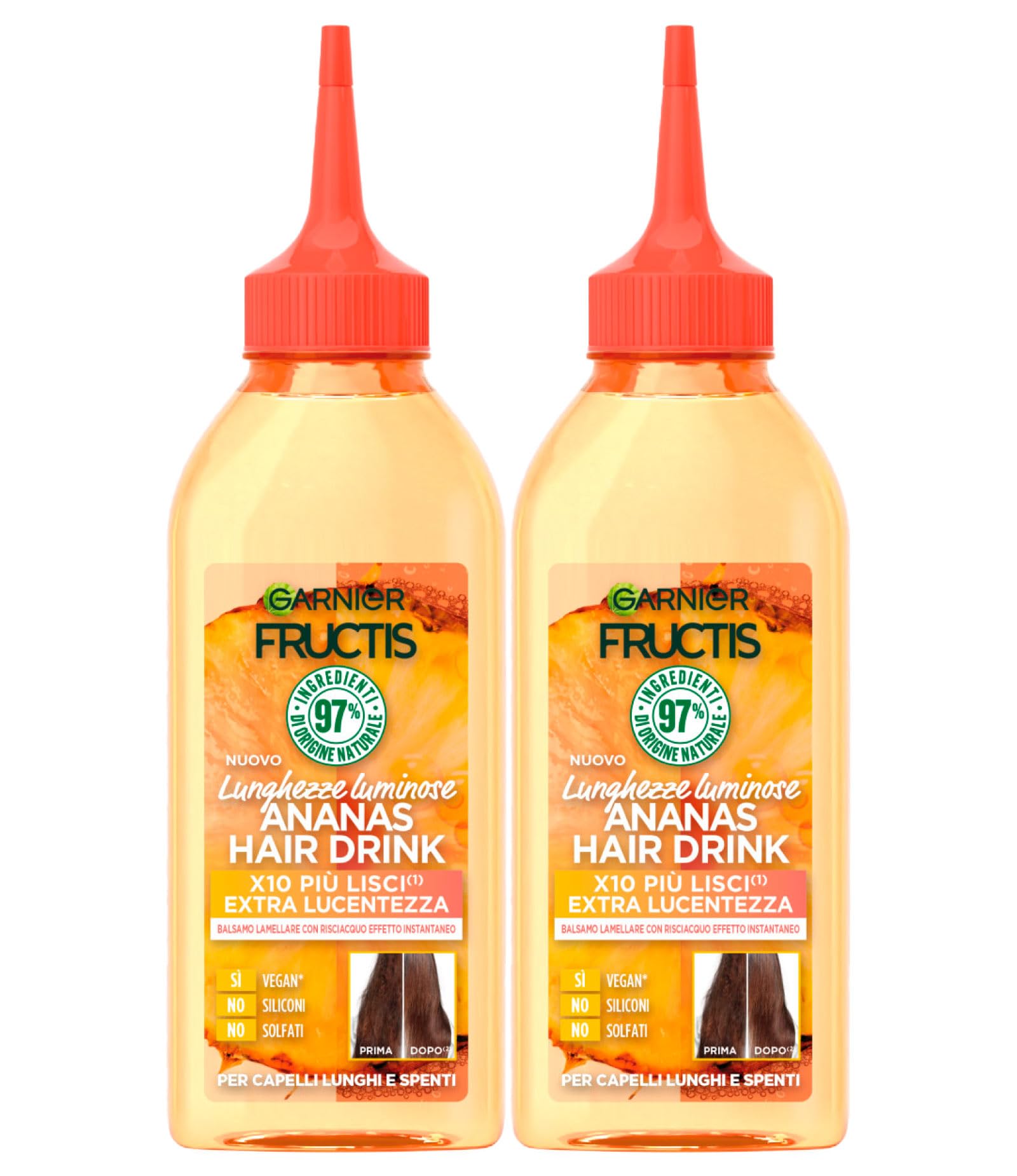 Conditioner with lamellar technology and pineapple extract, ideal for long, dull, and difficult-to-detangle hair. Deeply cleanses, nourishes, and hydrates hair for a healthier, shinier appearance. Vegan formula with 97 naturally derived ingredients, silicone-free. 2 x 200ml bottles INGREDIENTS 1261320 B - Ingredients: Propylene glycol • Alcohol denat. • Celetyl alcohol • Parfum Fragrance • Stearamidopropyl dimethylamine • Phyllanthus Emblica Fruit Extract • Ananas Sativus Fruit Extract Pineapple Fruit Extract • Dicaprylyl Carbonate • Dicaprylyl Ether • Aqua Water • Glycerin • Propylene Glycol Dicaprate Dicaprate • Caprylic Capric Triglyceride • Citric Acid • Tocopherol • Potassium Sorbate • Sodium Benzoate • Linalool • Coumarin • Citric • Citric • Lemon • Lemon • Lemon • Lemon • Lemon • Lemon • Lemon • Lemon • Ronellol • Benzyl Alcohol • Benzyl Salicylate (F.I.L. Z70016218 1) - The ingredient lists of our branded products are regularly updated. We therefore invite you to read the list on the product packaging to ensure that the ingredients are suitable for your personal use. INSTRUCTIONS FOR USE Apply to the lengths of your hair after shampooing. Use 1 to 2 pumps for fine hair, 2 to 3 pumps for thick hair. Massage for 10 seconds. Rinse. SAFETY WARNING For external use only. See moreAfter shampooing, apply the product directly to the lengths of your hair. Use 1 or 2 pumps for fine hair, 2 or 3 for thick hair. Massage for 10 seconds. Rinse and dry. Its vegan formula with 97 naturally derived ingredients gives hair a natural touch, leaving it smoother, more supple, and healthier. Silicone and sulfate-free. Deeply cleanses, nourishes, and hydrates unruly hair, instantly making it smoother and shinier. This lamellar conditioner is ideal for long, dull, and difficult-to-detangle hair. The kit contains: 2 x 200ml bottles of Garnier Fructis Hair Drink Pineapple Lamellar Conditioner for Shiny Lengths.Garnier Fructis Hair Drink Ananas Baume Lamellaire Longueurs Lumineuses pour Cheveux Long et Éteints Action Démêlante Nettoie Nourrit Hydrate - 2 flacons de 200 mlDESCRIPTION DU PRODUIT DESCRIPTION DU PRODUIT Après-shampoing avec technologie lamellaire et avec extrait d'ananas idéal pour les cheveux longs et ternes, difficiles à démêler. Nettoie, nourrit et hydrate en profondeur les cheveux pour un aspect plus sain et lumineux. Formule végétalienne avec 97 d'ingrédients d'origine naturelle, sans silicone. 2 flacons de 200 ml INGRÉDIENTS 1261320 B - Ingrédients : propyene glycol • alcool denat. • Célétyl alcool • Parfum Fragrance • Stearamidopropyl dimethylamine • Phyllanthus EMBLIca FrUIT EXTRACT • ANANAS SATIVUS FRUIT EXTRACT PINEAPPLE FRUIT EXTRACT • DICAPRYLYL CARBONATE • DICAPRYLYL ETHER • Aqua Water • GLYCERIN • PROPYLENE GLYCOL DICAPRYLATE DICAPRATE • CAPRYLIC CAPRIC TRIGLYCERIDE • CITRIC ACID • TOCOPHEROL • POTASSIUM SORBATE • SODIUM benzoate • LINALOOL • COUMARIN • CITRIC • CITRIC • CITRON • CITRON • CITRON • CITRON • CITRON • CITRON • CITRON • CITRON • Ronellol • BENZYL ALCOHOL • BENZYL SALICYLATE (F.I.L. Z70016218 1) - Les ingrédients lists de nos produits de marque sont régulièrement mis à jour. We therefore invite you to read the list on the product packaging to ensure that the ingredients are suitable for your personal use. MODE D'EMPLOI Appliquer sur les longueurs après le shampooing. Utilisez 1 à 2 doses pour les cheveux fins, 2 à 3 doses pour les cheveux épais. Masser pendant 10 secondes. Rincer. AVERTISSEMENT DE SÉCURITÉ Usage extérieur uniquement Voir plusAprès le shampooing, appliquez le produit directement sur les longueurs. Utiliser 1 ou 2 doses pour cheveux fins, 2 ou 3 pour cheveux épais. Masser pendant 10 secondes. Rincer et sécher. Sa formule végétalienne avec 97 d'ingrédients d'origine naturelle apporte une touche naturelle aux cheveux, qui seront plus lisses, plus souples et plus sains. Sans silicone ni sulfates. Nettoie, nourrit et hydrate en profondeur les cheveux indisciplinés, les rendant plus lisses et lumineux de manière instantanée. Après-shampooing lamellaire idéal pour cheveux longs et ternes, difficiles à démêler. Le kit contient : 2 flacons de Garnier Fructis Hair Drink Ananas Baume Lamellaire Longueurs Lumineuses de 200 ml.