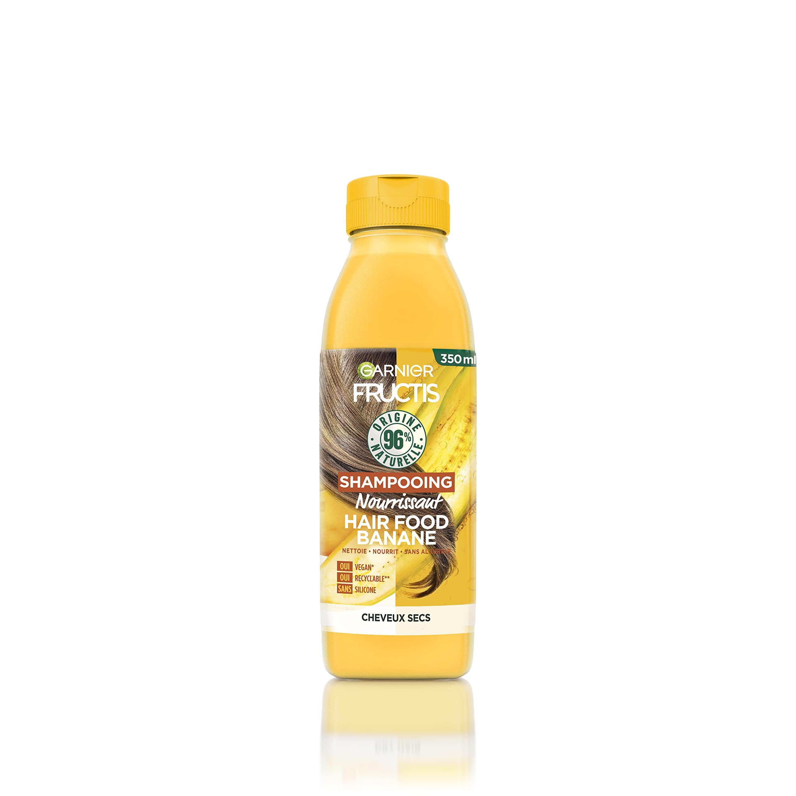 Contents: 1x Garnier Fructis Hair Food Nourishing Shampoo, Banana, 350 ml. Vegan formula made with 98 naturally derived ingredients and 95 biodegradable. Silicone-free for a natural feel. Directions for use: Apply, lather, and rinse. Results: Intensely nourishes hair. Nourishing banana shampoo for dry hair. Suitable for all hair types, whether straight or curly.