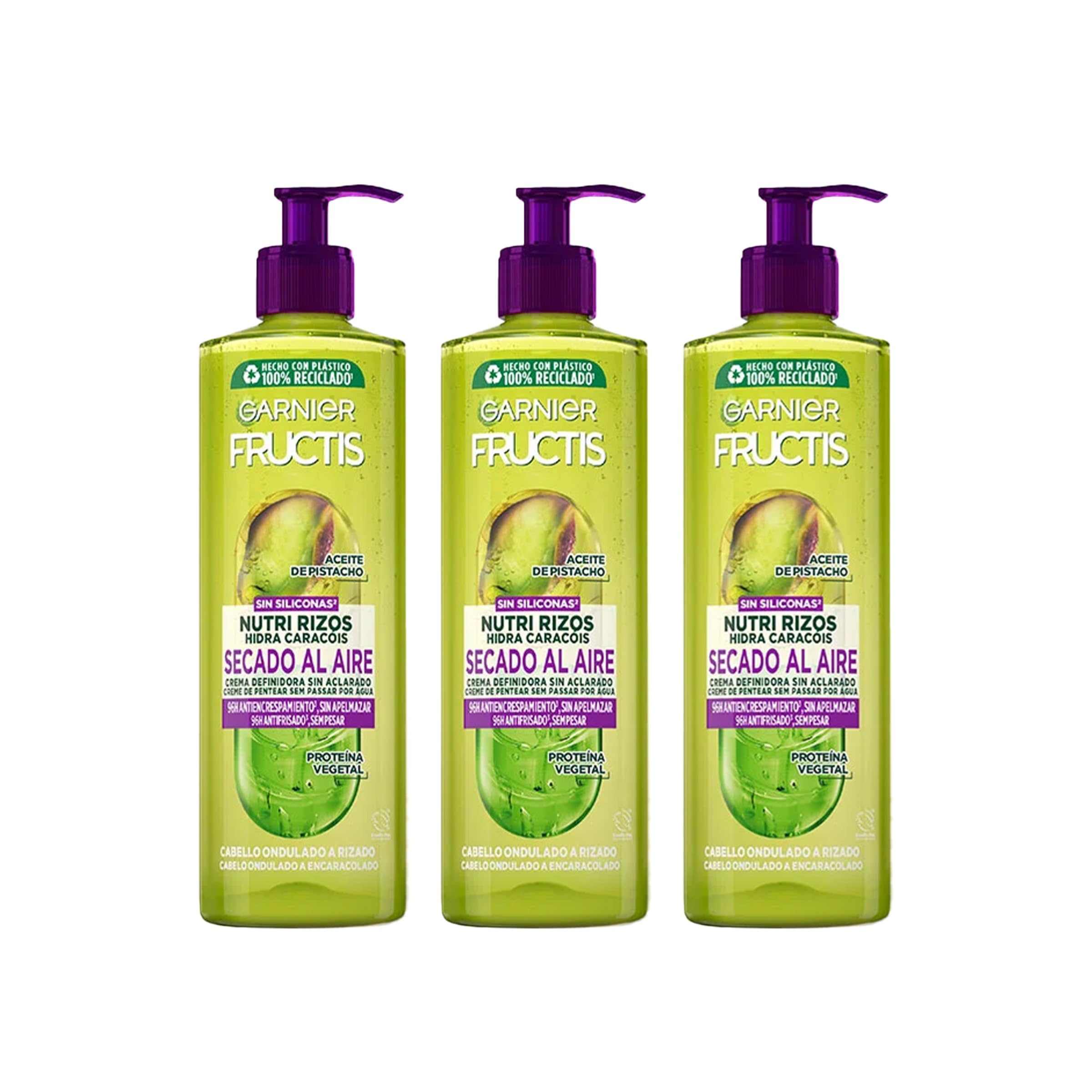 Set of 3 leave-in conditioners for curly or wavy hair with pistachio oil and pectin. Adds body and movement to curls without the need for a hairdryer. Defined and nourished curls regain their natural elasticity and bounce, without crunching or weighing them down. 96-hour frizz control, even in 80 humidity. Apply a small amount to damp or dry hair, leave in, and allow to air dry. Formula with fortifying fruit and plant extracts, vitamins B3 and B6, and lemon protein derivative. Dermatologically tested. Packaging made with 25 recycled plastic and 100 recyclable. Contents: 3 x Garnier Fructis Nutri Curls Air Dry Leave-In Cream, 400 ml INGREDIENTS Aqua WATER • CETEARYL ALCOHOL • PARAFFINUM LIQUIDUM MINERAL OIL • CAMELLIA SINENSIS LEAF EXTRACT • PISTACIA VERA SEED OIL • FUMARIC ACID • NIACINAMIDE • SACCHARUM OFFICINARUM EXTRACT Sugarcane Extract • LEUCONOSTOC FILTRATE RADISH ROOT FERMENT • GLYCERIN • TRIDECETH-6 • AMODIMETHICONE • BEHENTRIMONIUM CHLORIDE • PYRIDOXINE HCL • ISOPROPYL ALCOHOL • GUAR HYDROXYPROPYL TNT RIMONIUM CHLORIDE • SUCROSE • HYDROXYPROPYLTRIMONIUM LEMON PROTEIN • CITRIC ACID • CITRUS CITRUS CITRUS PEEL EXTRACT LEMON PEEL EXTRACT • PECTIN • PYRUS MALUS FRUIT EXTRACT APPLE FRUIT EXTRACT • SODIUM BENZOATE E • PHENOXYETHANOL • CHLORHEXIDINE DIGLUCONATE • CETRIMONIUM CHLORIDE • LINALOOL • GERANIOL • COUMARIN • LIMONENE • BENZYL ALCOHOL • PARFUM FRAGRANCE DIRECTIONS FOR USE Apply the product cap to damp or dry hair, without lightening, and allow to air dry. See moreContents: 3 x Garnier Fructis Nutri Curls Leave-In Cream, Air Dry, 400 ml. Formula with fortifying fruit and plant extracts, vitamins B3 and B6, and lemon protein derivative. Dermatologically tested. Packaging made with 25 recycled plastic and 100 recyclable. Apply a small amount to damp or dry hair, leave in, and allow to air dry. Defined and nourished curls regain their natural elasticity and bounce, without frizz or weight. 96-hour frizz control, even in 80 humidity. Pack of 3 leave-in creams for curly or wavy hair with pistachio oil and pectin. Adds body and movement to curls without the need for a hairdryer.Garnier Fructis, Crème sans rinçage pour cheveux bouclés ou ondulés, avec pectine de fruits et huile de pistache, nourrit et définit vos boucles sans sèche-cheveux, lot de 3 x 400 mlDESCRIPTION DU PRODUIT DESCRIPTION DU PRODUIT Lot de 3 crèmes sans rinçage pour cheveux bouclés ou ondulés avec de l'huile de pistache et de pectine. Apporte corps et mouvement aux boucles sans besoin d'utiliser un sèche-cheveux. Boucles définies et nourries qui retrouvent leur élasticité naturelle et leur rebond, sans carottage ni alourdissement, 96h anti-frisottis même avec 80 d'humidité. Appliquer une noix du produit sur le Cheveux humides ou secs, sans Rinçage, laisser sécher à l'air – Formule avec actifs fortifiants de fruits et plantes, vitamines B3 et B6 et dérivé de protéine de citron, testé dermatologiquement, emballage avec 25 de plastique recyclé et 100 recyclable. Contenu : 3 x crème sans rinçage Nutri boucles séchage à l'air Garnier Fructis, 400 ml INGRÉDIENTS Aqua WATER • CETEARYL ALCOOL • PARAFFINUM LIQUIDUM MINERAL OIL • CAMELLIA SINENSIS LEAF EXTRAIT • PISTACIA VERA SEED OIL • FUMARIC ACID • NIACINAMIDE • SACCHARUM OFFICINARUM EXTRACT Sugarcane Excel TRACT • FILTRATE DE LEUCONOSTOC RADISH ROOT FERMENT • GLYCERIN • TRIDECETH-6 • AMODIMETHICONE • BEHENTRIMONIUM CHLORIDE • PYRIDOXINE HCL • ISOPROPYL ALCOHOL • GUAR HYDROXYPROPYLTLTT. RIMONIUM CHLORIDE • SUCROSE • HYDROXYPROPYLTRIMONIUM LEMON PROTEIN • CITRIC ACID • CITRUS CITRUS CITRUS PEEL EXTRACT LEMON PEEL EXTRACT • PECTIN • PYRUS MALUS FRUIT EXTRACT APPLE FRUIT EXTRACT • SODI. UM BENZOATE E • PHENOXYETHANOL • CHLORHEXIDINE DIGLUCONATE • CETRIMONIUM CHLORIDE • LINALOOL • GERANIOL • COUMARIN • LIMONENE • BENZYL ALCOOL • PARFUM FRAGRANCE MODE D'EMPLOI Appliquez le bouchon du produit sur cheveux humides ou secs, sans éclaircir, laissez sécher à l'air. Voir plusContenu : 3 x crème sans rinçage Nutri boucles séchage à l'air Garnier Fructis, 400 ml. Formule aux actifs fortifiants de fruits et plantes, vitamines B3 et B6 et dérivé de protéine de citron, testé dermatologiquement, emballage avec 25 de plastique recyclé et 100 recyclable. Appliquer une noix du produit sur cheveux humides ou secs, sans rinçage, laisser sécher à l'air libre. Boucles définies et nourries qui retrouvent leur élasticité naturelle et leur rebond, sans carottis ni alourdissements, 96h anti-frisottis même avec 80 d'humidité. Lot de 3 crèmes sans rinçage pour cheveux bouclés ou ondulés avec huile de pistache et pectine. Apporte corps et mouvement aux boucles sans besoin d'utiliser un sèche-cheveux.