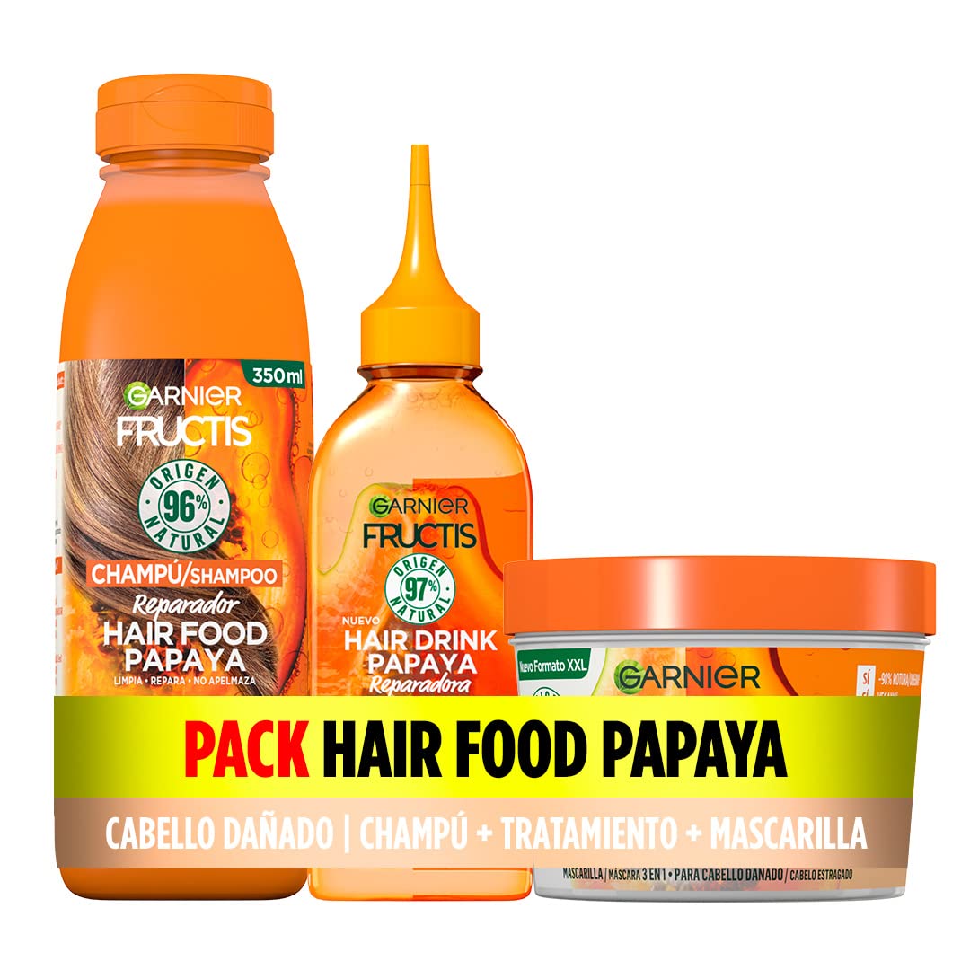 Discover the Fructis Hair Food Menu Papaya Repair Pack: a complete routine packed with natural nutrients for damaged hair. The pack includes a shampoo, a hair drink treatment, and a 3-in-1 mask to provide your hair with the care and attention it needs. INSTRUCTIONS FOR USE Apply the shampoo to wet hair, gently massage the scalp, and rinse thoroughly. Then, apply the mask and or treatment, leave on for a few minutes, and rinse again.