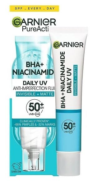 Dermatologically tested. Reduces imperfections such as pimples, acne marks, and enlarged pores. Protects skin from prolonged UVB, UVA, and UVA rays. SPF 50. With BHA and Niacinamide.
