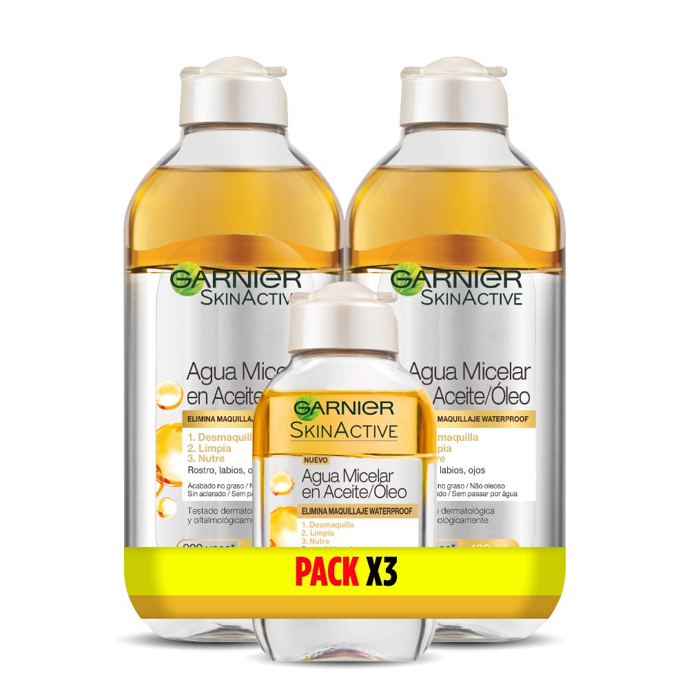 Micellar water in oil cleanses, removes makeup, and nourishes. Effective against waterproof and long-lasting makeup. Cleanses, removes makeup, and nourishes in one step. Suitable for lips, face, and eyes. Non-greasy finish. Shake to combine with the oil, dampen a cotton pad, and sweep over the face. To dissolve eye and lip makeup, leave the cotton pad on for a few seconds no need to rinse. Effective formula that combines the action of micelles with argan oil. Non-greasy finish suitable for all skin types. Ophthalmologically and dermatologically tested. Contents: 2 x Garnier Skin Active Micellar Water in Oil, 400 ml 1 x Garnier Skin Active Micellar Water in Oil, 100 mlContents: 2 x Garnier Skin Active Micellar Water in Oil, 400 ml 1 x Garnier Skin Active Micellar Water in Oil, 100 ml. Effective formula combining the action of micelles with argan oil, non-greasy finish suitable for all skin types, ophthalmologically and dermatologically tested. Shake to blend with the oil, dampen a cotton pad and sweep over the face to dissolve eye and lip makeup. Leave the cotton pad on for a few seconds no need to rinse. Cleanses, removes makeup, and nourishes in one step. Suitable for lips, face, and eyes, with no greasy finish. Micellar water in oil cleanses, removes makeup, and nourishes, effective against waterproof and long-lasting makeup.Garnier Skin Active Eau micellaire à l'huile, élimine le maquillage longue durée et waterproof, démaquillage, nettoie et nourrit les lèvres, les yeux et le visage, lot de 2 x 400 ml 1 x 100 ml PACK X3 EN HUILEDESCRIPTION DU PRODUIT Eau micellaire en huile, nettoie, démaquille et nourrit, efficace contre le maquillage waterproof et de longue durée. Nettoie, démaquille et nourrit en un seul geste. Convient pour les lèvres, le visage et les yeux. Sans finition grasse. Agiter pour fusionner avec l'huile, humidifier un coton et passer sur le visage. Pour dissoudre le maquillage des yeux et des lèvres, laisser reposer le coton quelques secondes, pas besoin de rinçage. Formule efficace qui combine la Action des micelles à l'huile d'argan, finition non grasse adaptée à tous les types de peaux, testée ophtalmologiquement et dermatologiquement - Contenu : 2 x eau micellaire dans l'huile Garnier Skin Active, 400 ml 1 x Eau Micellaire dans Huile Garnier Skin Active, 100 mlContenu : 2 x Eau Micellaire dans Huile Garnier Skin Active, 400 ml 1 x Eau Micellaire dans Huile Garnier Skin Active, 100 ml. Formule efficace associant l'action des micelles à l'huile d'argan, finition non grasse adaptée à tous les types de peaux, testée ophtalmologiquement et dermatologiquement. Agiter pour fusionner avec l'huile, humidifier un coton et passer sur le visage, pour dissoudre le maquillage des yeux et des lèvres, laisser reposer le coton quelques secondes, pas besoin de rinçage. Nettoie, démaquille et nourrit en un seul geste, convient pour les lèvres, le visage et les yeux, sans finition grasse. Eau micellaire en huile, nettoie, démaquille et nourrit, efficace contre le maquillage waterproof et de longue durée.