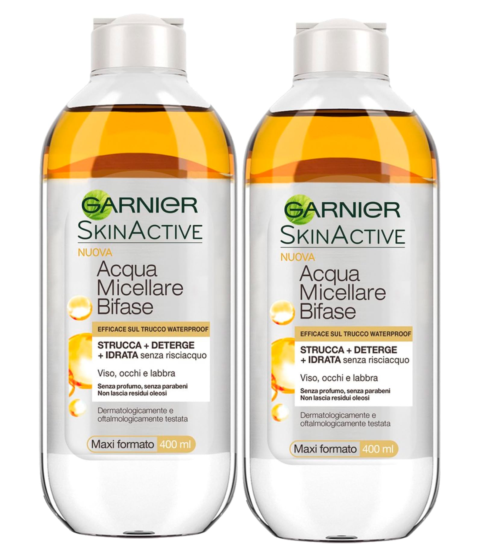 Garnier SkinActive Eau Micellaire Biphasée Sans Rinçage Enlève Maquillage Imperméable Action Démaquillant Nettoyant Hydratant Visage Yeux Lèvres Formule Sans Parfum - 2 Flacons 400 ml 2 x Micellaire biphasé Maquillage Waterproof