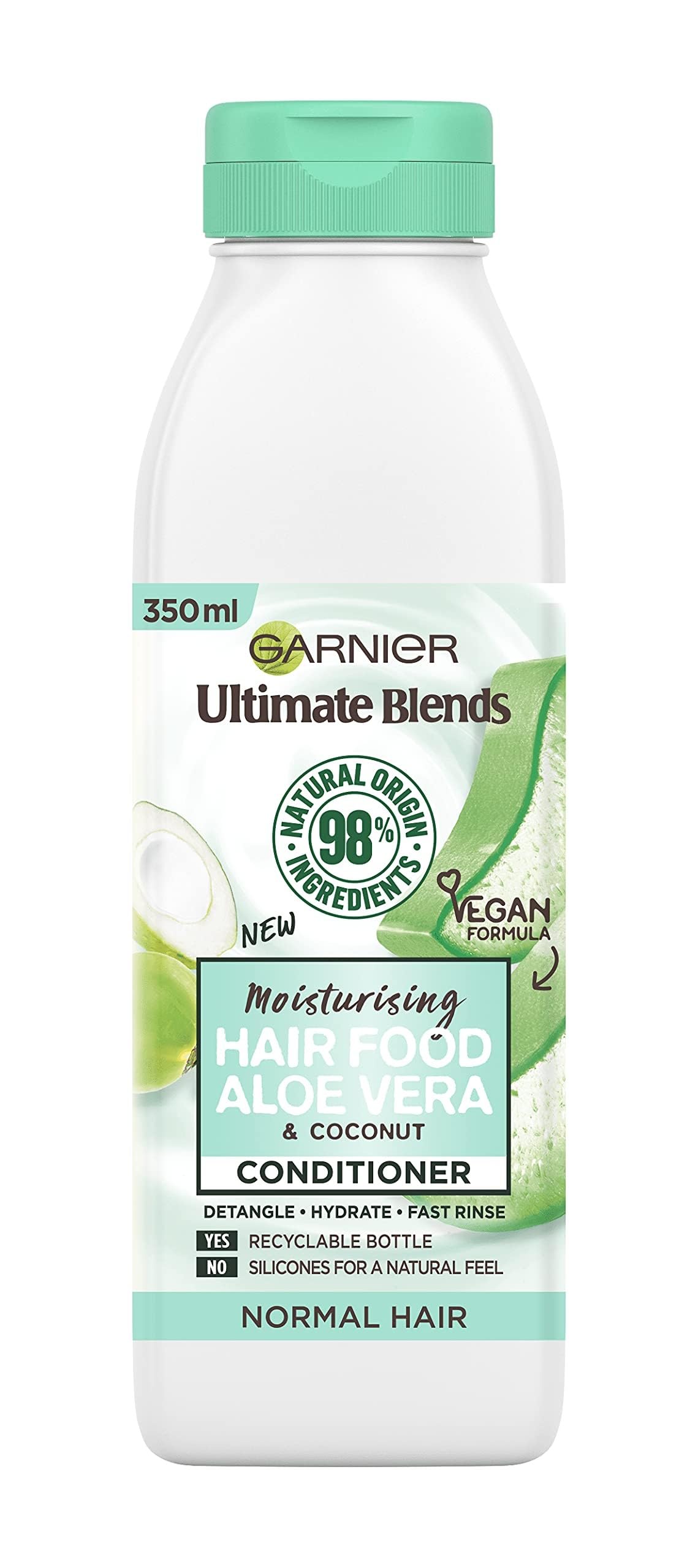 DESCRIPTION DU PRODUIT Hangry hair? Dig into Garnier Ultimate Blends hair food conditioner, our new way to nourish and condition Hangry hair. Super food for super hair! Yes: 98 natural origin YES: 100 vegan YES: recyclable bottle - Our bottles are 100 recyclable and made with 50 recycled plastic vegan formula - no animal Ingredients or by products dig into Garnier Ultimate Blends Aloe vera hair food conditioner to help moisturize normal hair, blended with aloe vera Coconut. Its ultra-melting, lightweight texture instantly absorbs to moisturize, quickly detangle and rinse. For softer, shinier, healthy-looking hair, as if hydrated. For more intense nourishment dig into our Aloe vera hair food 3-in-1 multi-use mask! Three ways to enjoy it: conditioner, mask, leave in.