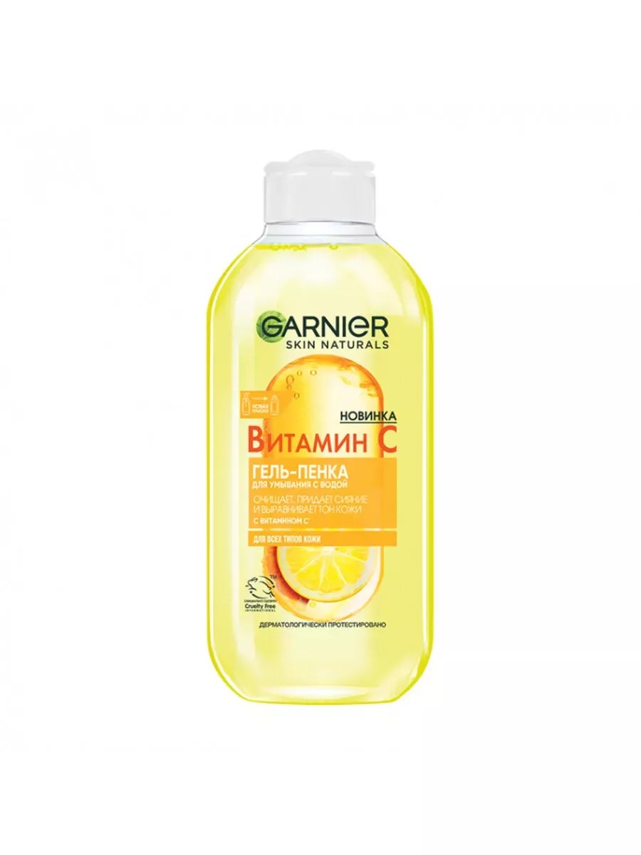 Garnier Гель-пенка для умывания с витамином С, 200 мл. Деликатно очистить кожу и наполнить ее сиянием поможет новинка от Garnier — гель-пенка для умывания из линейки «Витамин C». Формула продукта обогащена витамином C и цитрусом, которые способствуют осветлению пигментации и совершенствуют цвет лица. Приятная гелевая текстура бережно удаляет частички загрязнений и себума. А входящий в состав комплекс активных ингредиентов улучшает внешний вид кожи, делая ее тон сияющим.