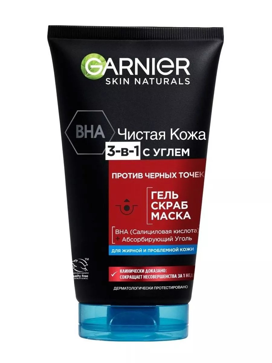 3-в-1 это многофункциональное средство, которое не только визуально уменьшает черные точки и прыщи, но и помогает предотвратить их появление. 3-в-1 это одновременно Гель для умывания, Скраб и Маска:1. Гель для умывания: обогащенный Салициловой кислотой, известной своими антибактериальными свойствами, гель интенсивно очищает кожу от загрязнений.2. Скраб: благодаря содержанию натуральных отшелушивающих частиц помогает эффективно бороться с закупоренными порами и черными точками.3. Маска: обогащенная абсорбирующим углем и экстрактом черники заметно уменьшает жирный блеск, оставляя ощущение комфорта на коже.