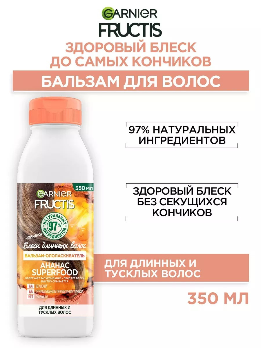 Новинка! Здоровый блеск до самых кончиков! Бальзам-ополаскиватель для волос Garnier Fructis Superfood Ананас обеспечивает легкое расчесывание, придает блеск и гладкость длинным, тусклым, сухим и поврежденным волосам, сокращает количество секущихся кончиков.