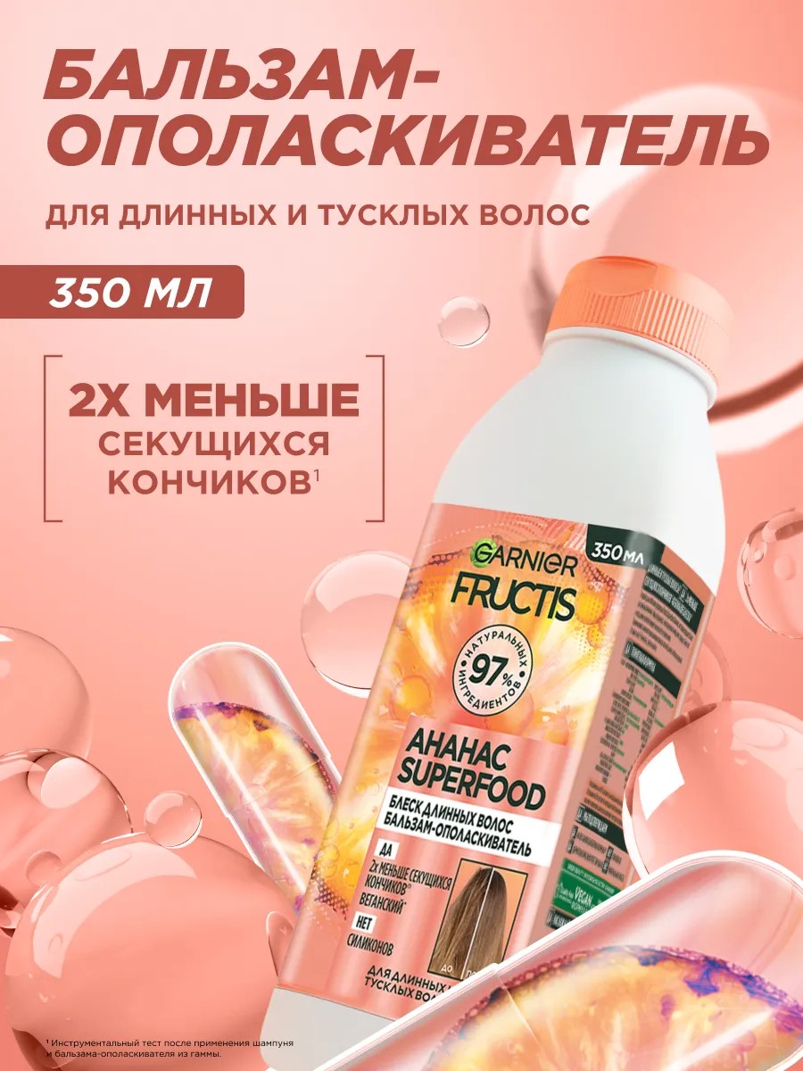 Новинка! Здоровый блеск до самых кончиков! Бальзам-ополаскиватель для волос Garnier Fructis Superfood Ананас обеспечивает легкое расчесывание, придает блеск и гладкость длинным, тусклым, сухим и поврежденным волосам, сокращает количество секущихся кончиков.