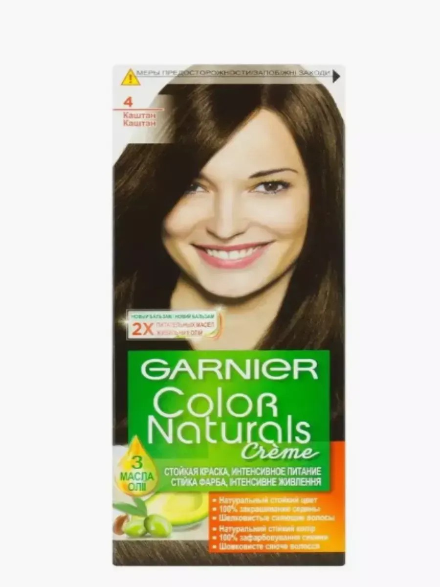 Color Naturals 4 Chestnut Hair Dye, 110 ml. Nourishing dye with a restorative care balm for more intense color, softness, and luxurious shine. The enveloping creamy texture penetrates deep into the hair shaft, delivering nutrients and color pigments for an even, rich color that resists fading for up to 8 weeks.