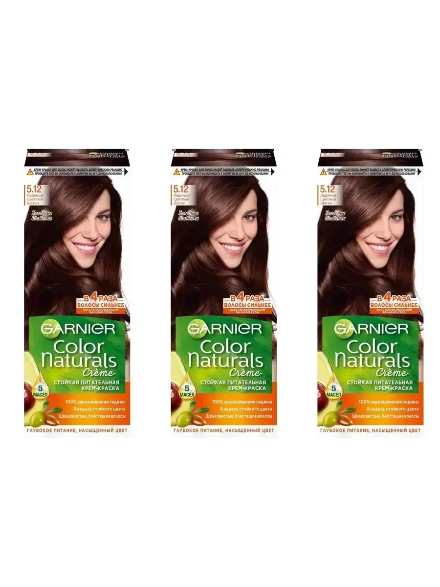 Garnier Стойкая крем-краска для волос Color Naturals тон 5.12 Ледяной светлый шатен, 110 мл, 3 штуки. Стойкая крем-краска Color Naturals с маслами обеспечивает комфортное окрашивание, выразительный цвет 100% без седины и интенсивное питание. Кремовая текстура равномерно распределяется по прядям и не течет. Масла в составе способствуют глубокому проникновению красителя в структуру волоса и защите пигмента от вымывания, а также обуславливают питательный уход. Оттенок выглядит насыщенным до 8 недель, а локоны сохраняют мягкость и блеск. Ухаживающий бальзам с 5 маслами: оливы, авокадо, ши, клюквы и арганы восстанавливает волосы и делает их в 4 раза более сильными. Результат: Питает и разглаживает волосы. Создает на поверхности волос защитный барьер против повреждений. Цвет зафиксирован и защищен от вымывания до 8 недель. Закрашивание 100% седины. Волосы в 4 раза более сильные. В комплект входит: флакон с молочком-проявителем (60 мл); тюбик с крем-краской (40 мл); бальзам-уход, обогащенный 5 маслами (12 мл); инструкция и пара перчаток.