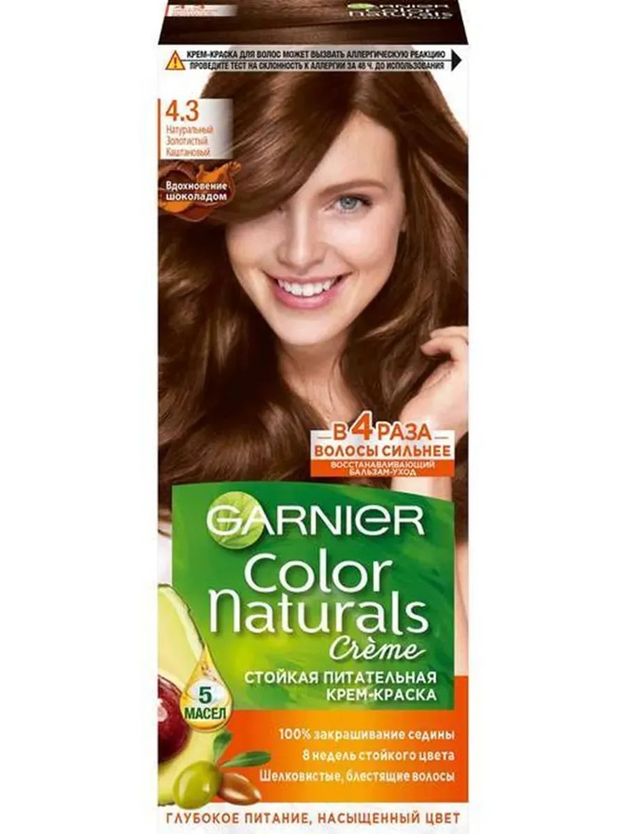 Garnier, Hair Dye, "Color Naturals", shade 4.3, Golden Chestnut. GARNIER Hair Dye Color naturals №4.3 Golden Chestnut GARNIER COLOR NATURALS gives hair rich, long-lasting color and amazing shine. The special Garnier Color Naturals formula, enriched with three oils, penetrates to the very heart of the hair and intensively nourishes it. Thanks to deep nutrition, hair is better saturated with color and retains it for a long time. The cream dye has a creamy texture that is easy to apply, does not run, and has a pleasant aroma. Guarantees 100% gray coverage. GARNIER COLOR NATURALS allows you to lighten (up to 4-6 tones), darken, or enrich your natural hair color. One package of GARNIER COLOR NATURALS is enough for up to 3 root touch-ups.