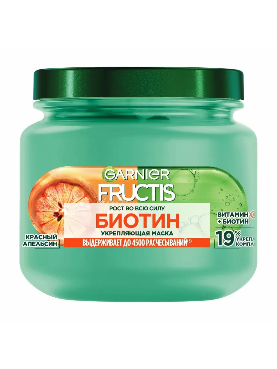 Garnier, фруктис маска для волос рост во всю силу 320 мл. Твои волосы выдержат до 4500 расчёсывании благодаря 19% укрепляющему комплексу с витамином С и Биотином и экстракту красного апельсина, который делает волосы визуально более наполненными и сильными. Новая маска «Рост во всю силу. Биотин» имеет кремовую текстуру, которая активируется в при контакте с руками. Возьмите порцию маски и активируйте ее хлопком: вы увидите, как она превращается в клейкую паутинку, которую нанесите по всей длине, оставьте на несколько минут и затем смойте. Маска не утяжеляет и не оставляет следов, нет липкости и жирности на волосах.