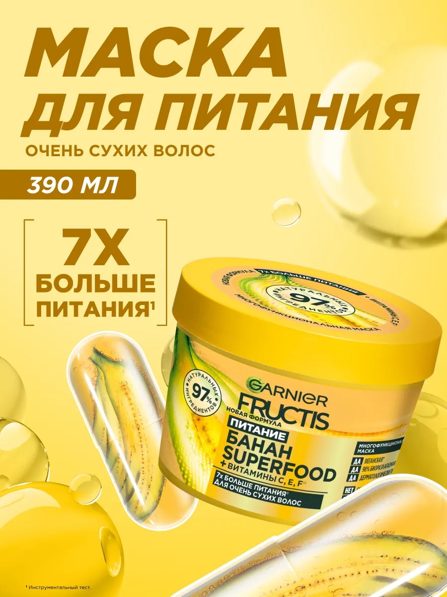 Попрощайся с сухостью волос! Представляем маску Fructis Superfood* Банан 3в1 для суперпитания твоих волос без эффекта утяжеления! Формула маски на 97% состоит из натуральных ингредиентов и обогащена силой банана — природного источника питания для твоих волос. Попробуй и оцени результат: 7Х больше питания* *Инструментальный тест, мягкие, шелковистые и сияющие красотой волосы!