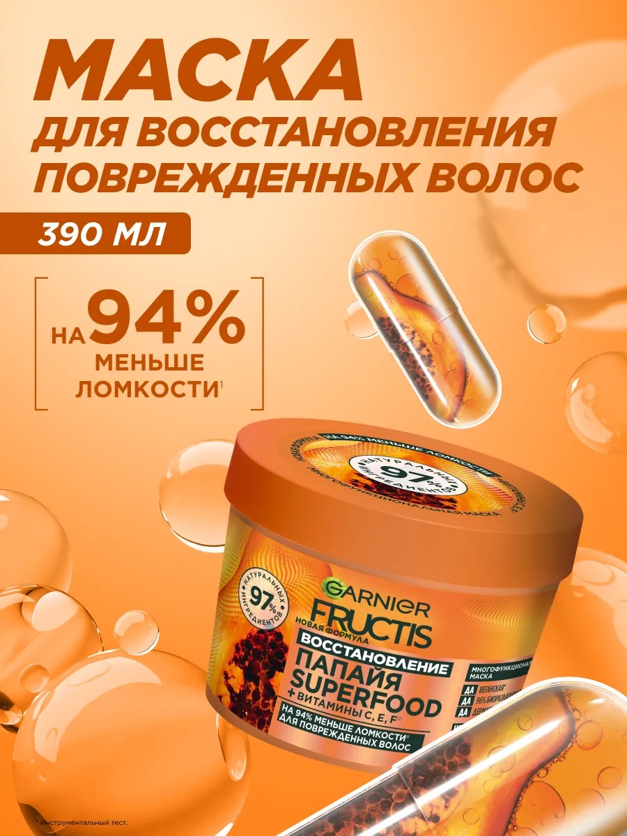 Подари интенсивное восстановление поврежденным волосам вместе с маской для волос Fructis Superfood Папайя 3в1! Формула маски на 97% состоит из натуральных ингредиентов, средство обогащено силой папайи и производными витаминами. Попробуй и оцени результат: на 94% меньше ломкости* *Инструментальный тест, восстановление волос без утяжеления!