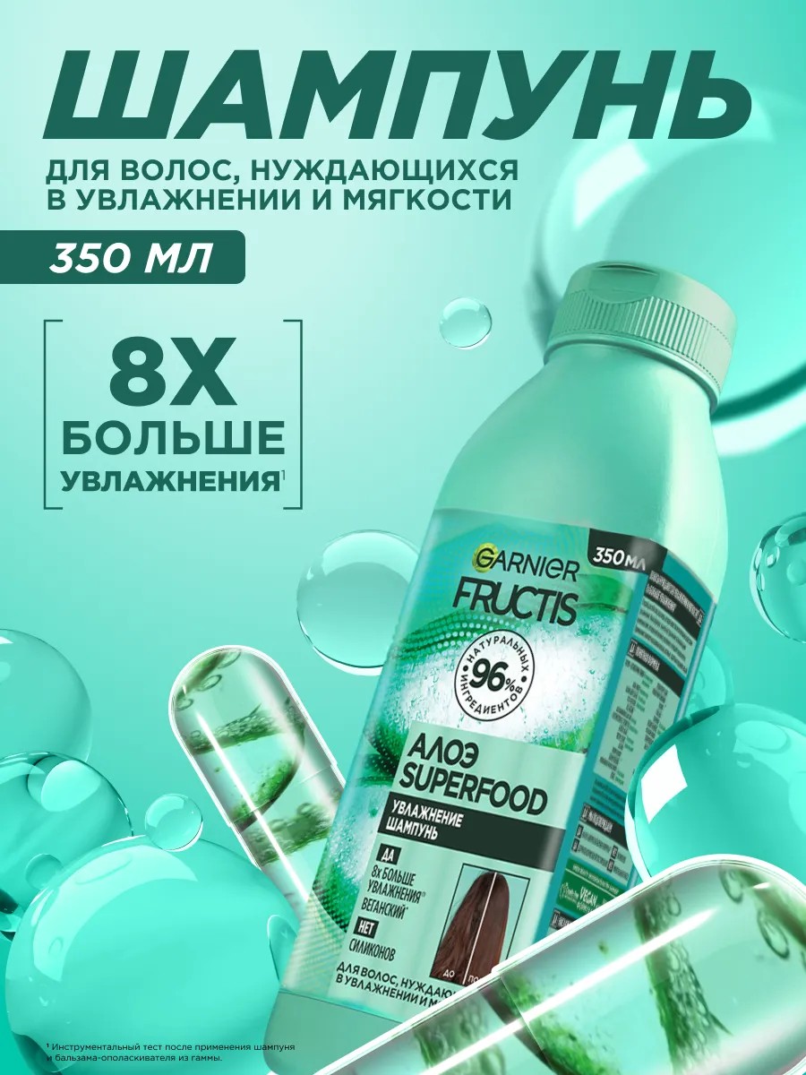 Первый веганский, на 96% натуральный шампунь Fructis (Фруктис) SUPERFOOD (Cуперфуд) от Garnier (Гарньер)! Легкая пена мягко очищает и интенсивно увлажняет волосы, без утяжеления! СПОСОБ ПРИМЕНЕНИЯ: Ничего необычного! Нанести шампунь СУПЕРФУД на волосы, вспенить и тщательно смыть. В случае попадания в глаза немедленно промыть водой. Не употреблять внутрь. Хранить в недоступном для детей месте. Веганский. 96% Биоразлагаемая формула. Дерматологически протестировано. Перерабатываемая упаковка. Без Силиконов.