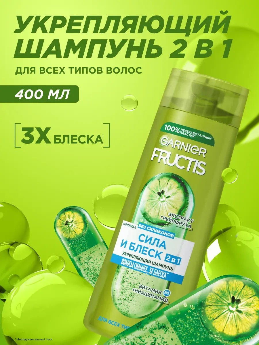 Fructis Шампунь для волос Фруктис Сила и Блеск 2в1 Твои волосы стали ослабленными и непослушными, потеряли сияние и естественный блеск? Представляем укрепляющий шампунь для волос Fructis Сила и Блеск 2в1 с улучшенной технологией! Формула шампуня обогащена витамином В6, ниацинамидом и экстрактом грейпфрута для заботы и эффектного преображения твоих волос!