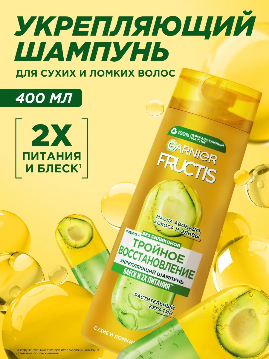 Пересушенные, ломкие и тусклые волосы? Шампунь для волос Fructis Тройное Восстановление — это твой первый шаг к преображению! Формула укрепляющего шампуня усилена маслами авокадо, кокоса и оливы, а также растительным кератином. Такое сочетание компонентов идеально подойдет для восстановления волос, интенсивного питания, мягкости и блеска!