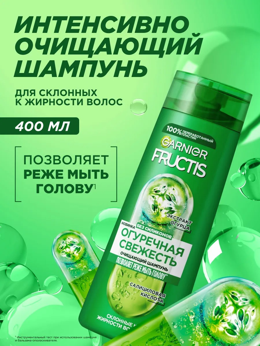 Твои волосы быстро теряют объем и уже к вечеру выглядят жирными? Представляем интенсивно очищающий шампунь Fructis Огуречная Свежесть, разработанный специально для волос, склонных к жирности! Формула шампуня обогащена экстрактом огурца и салициловой кислотой — компонентами эффективного для очищения волос и длительного чувства свежести!
