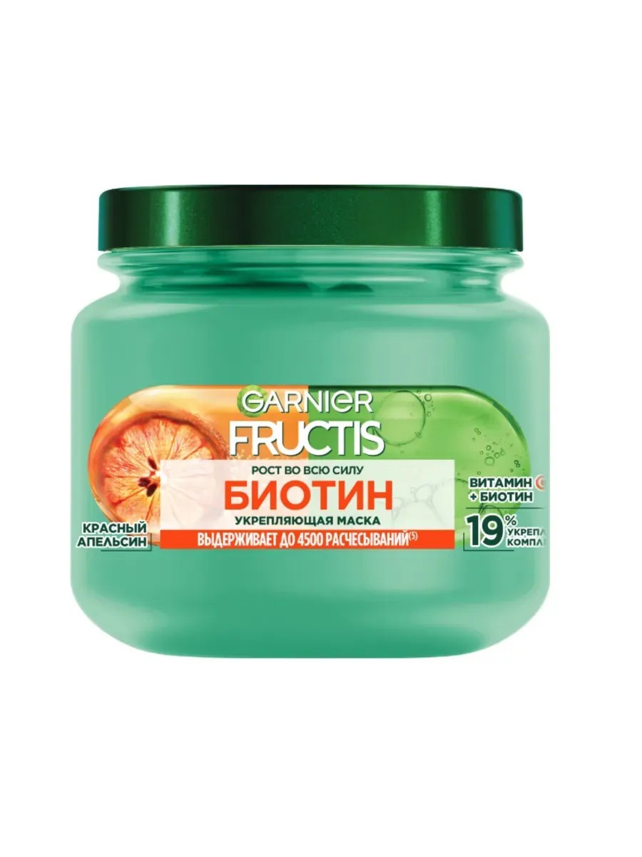 Garnier Маска для слабых волос Рост во всю силу Укрепляющая. 320 мл. Слабые волосы, склонные к выпадению? Открой новую укрепляющую маску «FRUCTIS. Рост во всю силу. БИОТИН». Твои волосы выдержат до 4500 расчёсывании благодаря 19% укрепляющему комплексу с витамином С и Биотином и экстракту красного апельсина, который делает волосы визуально более наполненными и сильными. Новая маска «Рост во всю силу. Биотин» имеет кремовую текстуру, которая активируется в при контакте с руками. Возьмите порцию маски и активируйте ее хлопком: вы увидите, как она превращается в клейкую паутинку, которую нанесите по всей длине, оставьте на несколько минут и затем смойте. Маска не утяжеляет и не оставляет следов, нет липкости и жирности на волосах.