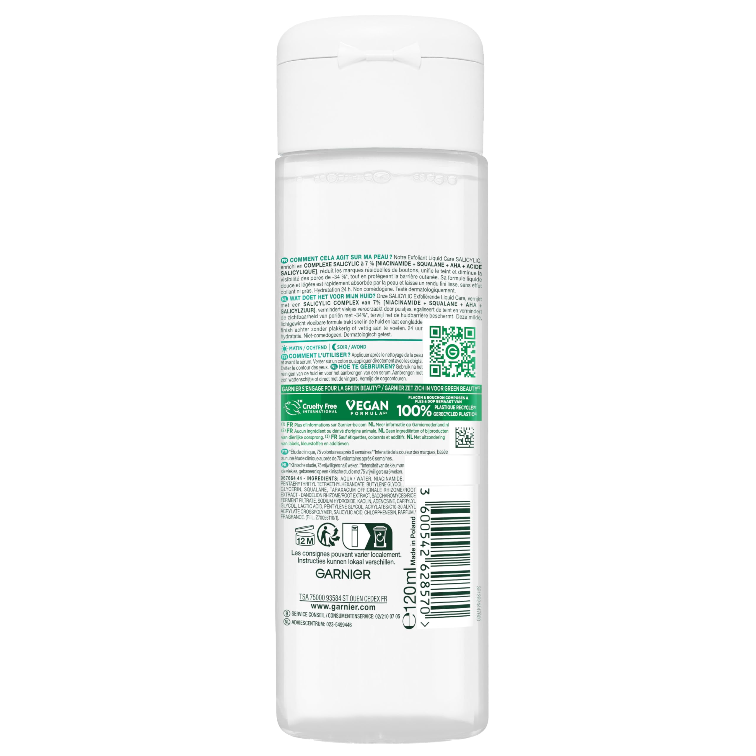 Do not use on the face. SAFETY WARNING Avoid contact with the eyes.Prepare the skin for your care routine. Suitable for sensitive skin. Provides hydration for up to 24 hours. Exfoliating Liquid Care for refined pores. Mild lightweight formula.Garnier Pure Active Salicylic Exfoliërende Liquid Care - Verfijnt de poriën - Met 7 [Niaciamide, Squalane, AHA Sallicylzuur] - 120 ml Niet gebruiken op het gezicht. VEILIGHEIDSWAARSCHUWING Vermijd contact met de ogen.Bereid de huid voor op jouw verzorgingsroutine. Geschikt voor de gevoelige huid. Biedt tot 24 uur hydratatie. Exfoliërende Liquid Care voor verfijnde poriën. Milde lichtgewicht formule.