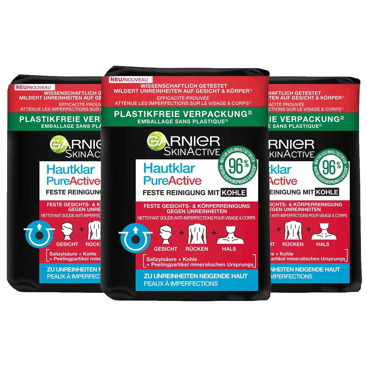 Garnier Firm Cleansing Cleanser is specially formulated for skin prone to impurities. The cleansing treatment with charcoal, salicylic acid, and mineral-based exfoliating particles is noticeable after one week. Thanks to its gentle exfoliating effect, dirt particles on the face, neck, and back are gently removed, and pores are clarified. Improves the appearance of the entire skin after one week – for full-body use. Designed to reduce impurities on the face and body – composed of 96 naturally derived ingredients – salicylic acid, charcoal, and mineral-based exfoliating particles – plastic-free packaging – 3 x Garnier PureActive Firm Cleansing Cleanser for SkinNumber of units: 300. Composed of 96 naturally derived ingredients. Reduces impurities on the face and body. Designed for full-body use. Improves the overall appearance of the skin after one week.Le nettoyage ferme de Garnier est spécialement conçu pour les peaux sujettes aux impuretés. Le soin nettoyant avec du charbon, de l'acide salicylique et des particules exfoliantes d'origine minérale est perceptible après une semaine. Grâce à l'effet exfoliant doux, les particules de saleté sur le visage, le cou et le dos sont éliminées en douceur et les pores sont clarifiés. Améliore l'apparence de la peau entière après une semaine - Pour une utilisation complète du corps. Conçu pour atténuer Impuretés sur le visage et le corps - Composé de 96 d'ingrédients d'origine naturelle - Acide salicylique, charbon et articles exfoliants - Emballage sans plastique d'origine minérale - 3 x Garnier clair pour la peau - Nettoyage ferme PureActiveNombre d'unités : 300.0. Composé à 96 d'ingrédients d'origine naturelle. Réduit les impuretés sur le visage et le corps. Conçu pour une utilisation complète du corps. Améliore l'apparence de l'ensemble de la peau après une semaine.Garnier PureActive Lot de 3 nettoyants solides pour le visage avec du charbon de bois 100 g chacun, 1 paquet