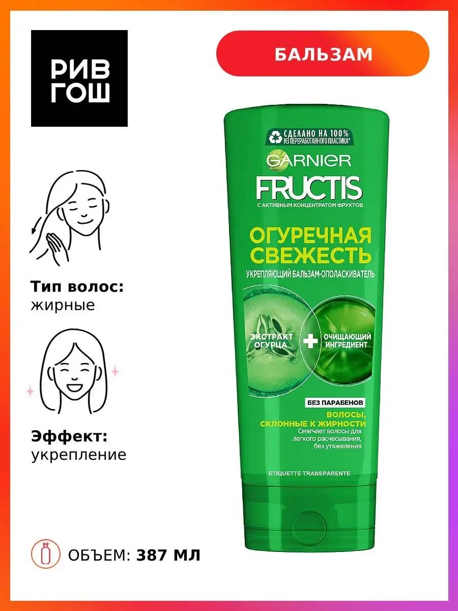 Cucumber Freshness Hair Balm, strengthening, for oily hair with vitamins B3 and B6 and cucumber extract. Directions: After shampooing, apply to damp hair along the entire length, avoiding the roots. Leave on for 2-3 minutes, then rinse. In case of contact with eyes, rinse immediately with water. Fructis Cucumber Freshness Conditioner for Oily Hair, 387 ml