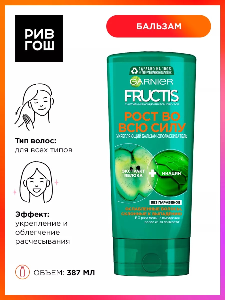 | Комплектация | Бальзам-ополаскиватель для ослабленных волос склонных к выпадению Fructis Рост Во Всю Силу, 387 мл |