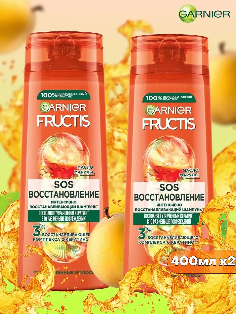 Женский Garnier Fructis (Гарнер фруктис) представляет систему восстановления волос, которая совмещает в себе суперфрукт натурального происхождения с активными ингредиентами. Шампунь Гарньер для жирных волос SOS Восстановление фрутис обогащен двумя суперингредиентами: Формула с маслом амлы и кератином питает также восстанавливает повреждения волос, вызванные внешними воздействиями (сушка феном, тепловая укладка). Доказано! Волосы выглядят более здоровыми, шелковистыми и блестящими. Шампунь против выпадения волос подойдет для ежденевного применения и увлажняющего ухода. Шампунь для роста волос устраняет 1 год повреждений за 3 применения. Шампунь фрути для сухих и поврежденных волос укрепляет поверхность волос по всей длине.