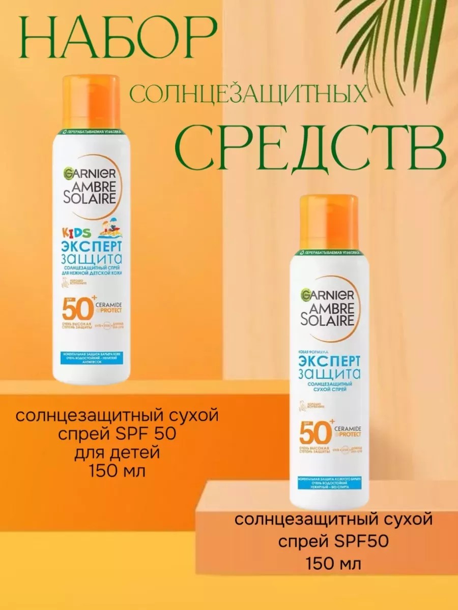 | Комплектация | Солнцезащитный сухой спрей SPF 50+-1 шт; Детский сухой спрей Ambre Solaire-1 шт |
