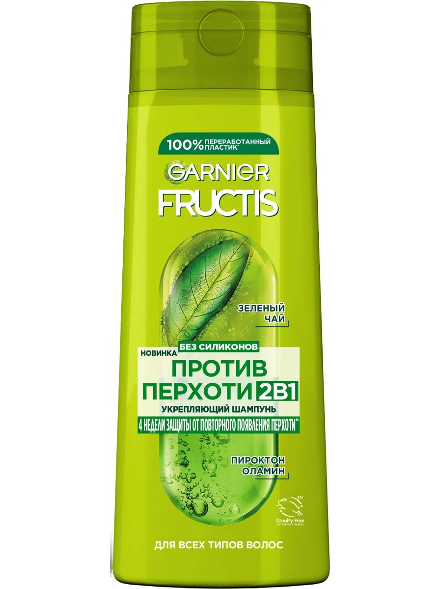 Garnier Fructis 2-in-1 Anti-Dandruff Shampoo for All Hair Types, Strengthening, Green Tea, 250 ml. The unique FRUCTIS 2-in-1 Anti-Dandruff formula, enriched with green tea and piroctone olamine, eliminates dandruff and adds shine. Result: Reduces dandruff from the first use. Hair is shinier. Reduces dandruff from the first use. Adds shine. Protects against the recurrence of dandruff for 2 weeks. Directions: Apply to damp hair, massage throughout, then rinse. In case of contact with eyes, rinse immediately with water. Ingredients: AQUA/WATER, SODIUM LAURETH SULFATE, COCO-BETAINE, GLYCOL DISTEARATE, GLYCERIN, SACCHARUM OFFICINARUM EXTRACT/SUGARCANE EXTRACT, CAMELLIA SINENSIS LEAF EXTRACT, CITRUS LIMON FRUIT EXTRACT/LEMON FRUIT EXTRACT, CITRUS LIMON PEEL OIL/LEMON PEEL OIL, PYRUS MALUS FRUIT EXTRACT/APPLE FRUIT EXTRACT, PPG-5-CETETH-20, PEG-55 PROPYLENE GLYCOL OLEATE, FUMARIC ACID, CARBOMER, NIACINAMIDE, LEUCONOSTOC/RADISH ROOT FERMENT FILTRATE, SODIUM CHLORIDE, SODIUM HYDROXIDE, PYRIDOXINE HCL, PROPYLENE GLYCOL, GUAR HYDROXYPROPYLTRIMONIUM CHLORIDE, HYDROXYPROPYLTRIMONIUM LEMON PROTEIN, CAPRYLYL GLYCOL, CITRIC ACID, OCTYLDODECANOL, SODIUM BENZOATE, SALICYLIC ACID, PHENOXYETHANOL, PIROCTONE OLAMINE, CI 19140/YELLOW 5, CI 42090/BLUE 1, LINALOOL, GERANIOL, ALPHA-ISOMETHYL IONONE, HYDROXYCITRONELLAL, HEXYL CINNAMAL, BENZYL ALCOHOL, PARFUM/FRAGRANCE