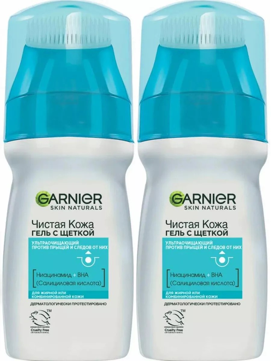 Garnier Гель с щеткой Skin Naturals Чистая кожа 2 шт по 150 мл. Чистая кожа актив эксфопро - очищающий гель с щеткой против прыщей. Инновация в борьбе с прыщами: 170 мягких и эластичных щетинок + выкоэффективная формула, обогащенная 2% салициловой кислотой, которая обладает антибактериальным действием, и регенерирующим фитокомплексом, обеспечивают усиленную эффективность в борьбе с прыщами. Глубоко и мягко очищает кожу, устраняет прыщи и жирный блеск. Состав: aqua/water, sodium laureth sulfate, decyl, glucoside, glycerin, sodium chloride, coco-betaine, salicylic acid, capryloyl salicylic acid, citric acid, copper pca, hexylene glycol, menthol, peg-150, pentaerythrityl tetrastearate, peg-6, caprylic/capric glycerides, pentasodium ethylenediamine tetramethylene phosphonate, polyquaternium-47, sodium hydroxide, tetrasodium edta, vaccinium myrtillus extract/vaccinium myrtillus fruit extract, zinc gluconate, parfum/fragrance