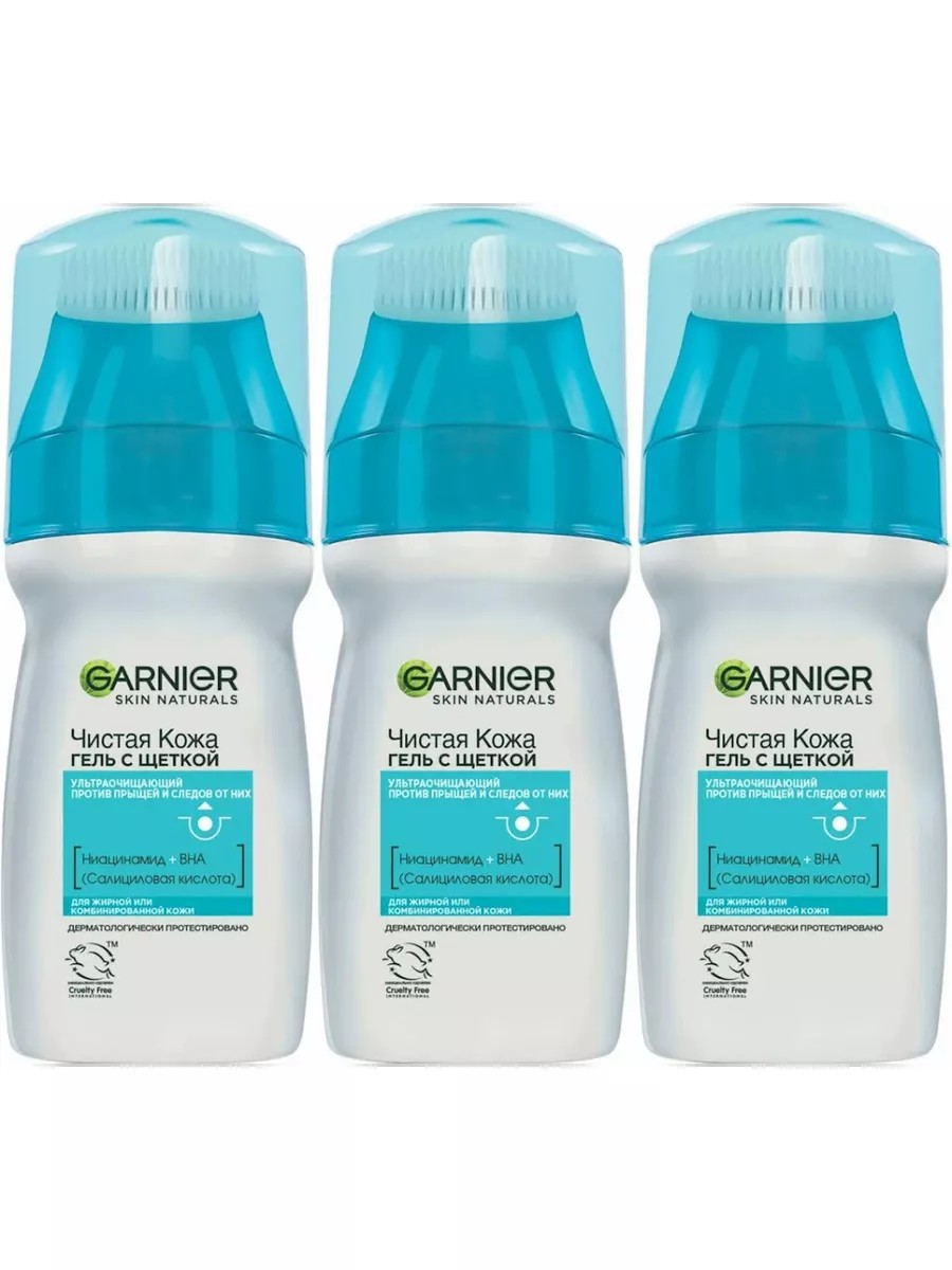 Garnier Гель с щеткой Skin Naturals Чистая кожа 3 шт по 150 мл. Чистая кожа актив эксфопро - очищающий гель с щеткой против прыщей. Инновация в борьбе с прыщами: 170 мягких и эластичных щетинок + выкоэффективная формула, обогащенная 2% салициловой кислотой, которая обладает антибактериальным действием, и регенерирующим фитокомплексом, обеспечивают усиленную эффективность в борьбе с прыщами. Глубоко и мягко очищает кожу, устраняет прыщи и жирный блеск. Состав: aqua/water, sodium laureth sulfate, decyl, glucoside, glycerin, sodium chloride, coco-betaine, salicylic acid, capryloyl salicylic acid, citric acid, copper pca, hexylene glycol, menthol, peg-150, pentaerythrityl tetrastearate, peg-6, caprylic/capric glycerides, pentasodium ethylenediamine tetramethylene phosphonate, polyquaternium-47, sodium hydroxide, tetrasodium edta, vaccinium myrtillus extract/vaccinium myrtillus fruit extract, zinc gluconate, parfum/fragrance