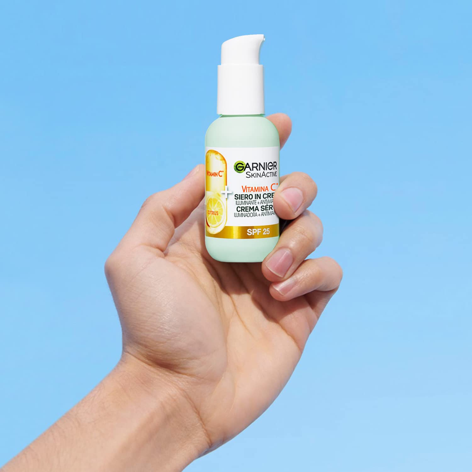Vitamin C serum and moisturizer SPF25 in one product, prevents and reduces skin spots and brightens the complexion, Suitable for all skin types, non-greasy - radiant and even looking skin, skin spots and fatigue ( Clinical cosmetic test on 47 women after 56 days), Skin embodies healthier and more radiant in just 3 days - One dose of daily on the cleansed face, massage gently to promote absorption to promote - Powerful formula enriched with vitamin C, light and quickly absorbed texture, practical dispenser applicator for optimal dosage - Contents: 1x Garnier serum made from vitamin C cream SkinActive, 2-in-1 vitamin C serum and moisturizer SPF25, anti-spots and brightener, 50 ml Instructions for use Apply daily to the cleansed face. Non-greasy. VEILIGHEIDSWAARSCHUWING For external use only. Avoid contact with eyes. Keep away from naked flame or direct heat sources.Vitamin C serum and moisturizer SPF25 in one product, prevents and reduces skin spots and brightens the complexion, suitable for all skin types, non-greasy.Garnier SkinActive, 2-in-1-Serum aus Vitamin C Creme und Feuchtigkeitscreme SPF25, Anti-Flecken und Aufhellung, nicht fettend, geeignet für alle Hauttypen, 50 ml Beschreibung Produktbeschreibung Vitamin C-Serum und Feuchtigkeitscreme SPF25 in einem Produkt, beugt Hautflecken vor und reduziert Hautflecken und hellt den Teint auf, Geeignet für alle Hauttypen, nicht fettend - strahlend und gleichmäßig aussehende Haut, Hautflecken und Müdigkeit ( Klinischer Kosmetik-Test an 47 Frauen nach 56 Tagen), Hautverkörpert gesünder und strahlender in nur 3 Tagen - Eine Dosis von Täglich auf dem gereinigten Gesicht, sanft einmassieren, um die Absorption zu fördern - Leistungsstarke Formel angereichert mit Vitamin C, leichte und schnell einziehende Textur, praktischer Spenderapplikator für eine optimale Dosierung - Inhalt: 1x Garnier Serum aus Vitamin C Creme SkinActive, 2-in-1 Vitamin C Serum und Feuchtigkeitscreme SPF25, Anti-Flecken und Aufheller, 50 ml Gebrauchsanweisung Täglich auf das gereinigte Gesicht auftragen. Nicht fettend. VEILIGHEIDSWAARSCHUWING For external use only. Avoid contact with eyes. Keep away from naked flame or direct heat sources.Vitamin C Serum und Feuchtigkeitscreme SPF25 in einem Produkt, verhindert und reduziert Hautflecken und hellt den Teint auf, Geeignet für alle Hauttypen, Nicht fettend.