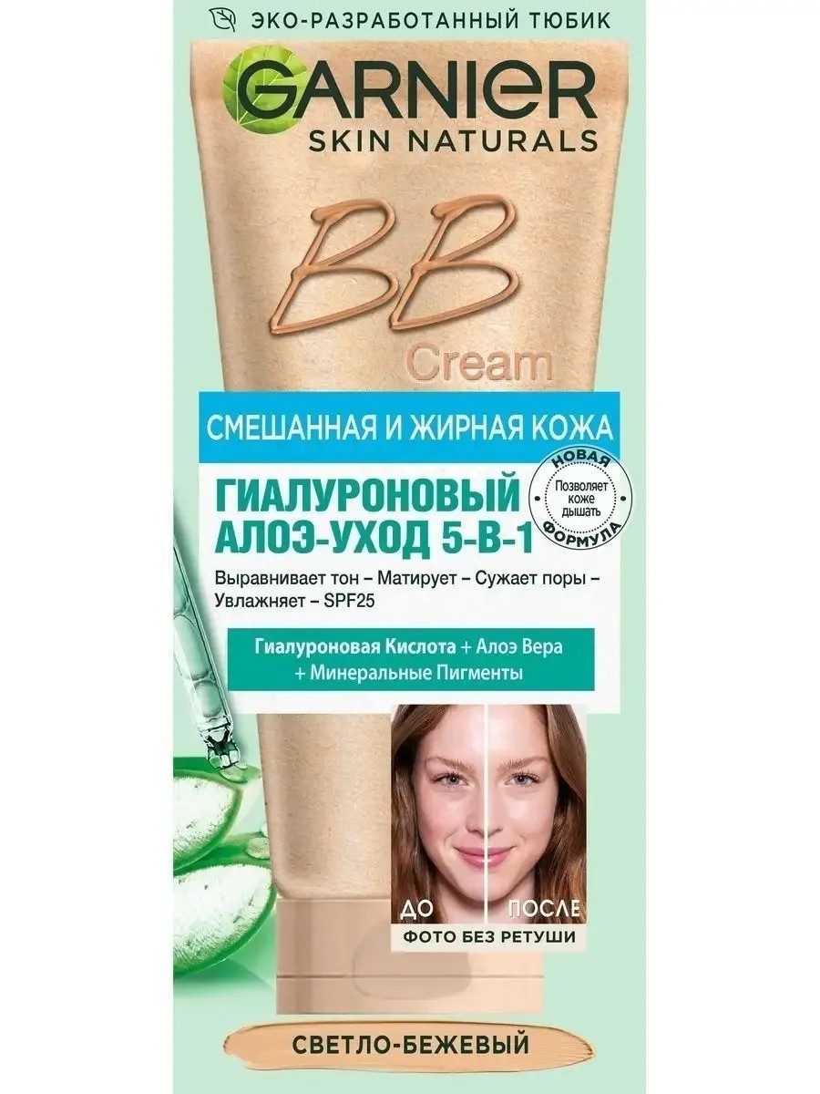 Наша новая формула от Гарньер. Легкая текстура создает ощущение комфорта и позволяет коже дышать. Формула обогащена: Гиалуроновой кислотой для интенсивного увлажнения, Экстрактом алоэ вера для смягчения и большего комфорта, Ультратонкими минеральными пигментами для естественного и сияющего результата. Используйте BB cream как тональное средство, увлажняющий крем, защиту SPF25. Доказанная эффективность BB cream: Мгновенно выравнивает тон кожи лица, Матирует, Поры менее заметны, Кожа заметно увлажнена, защита SPF25 от ультрафиолетовых лучей.