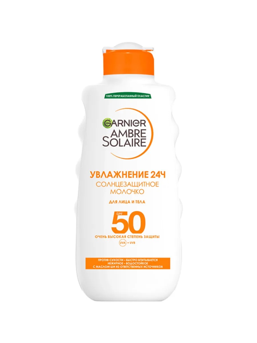 Garnier, Ambre Solaire Sunscreen Milk SPF 50+, 200 ml. Suitable for face and body. Prolonged sun exposure is dangerous, even with sunscreen, as it does not provide 100% protection. Exposure to the sun during peak hours is not recommended. Apply immediately before sun exposure. Composition: Aqua/water, isopropyl palmitate, glycerin, octocrylene, ethylhexyl salicylate, butyl methoxydibenzoylmethane, titanium dioxide [nano]/titanium dioxide, alcohol denat., ethylhexyl triazone, talc, stearic acid, potassium cetyl phosphate, diisopropyl sebacate, synthetic wax, tocopherol, phenoxyethanol, thermus thermophillus ferment, peg-100 stearate, eugenol, triethanolamine, palmitic acid, linalool, benzyl alcohol, caprylyl glycol, terephthalylidene dicamphor sulfonic acid, acrylates/c10-30 alkyl acrylate crosspolymer, myristic acid, disodium edta, butyrospermum parkii butter/shea butter, potassium sorbate, citric acid, aluminum hydroxide, glyceryl stearate, parfum/fragrance.