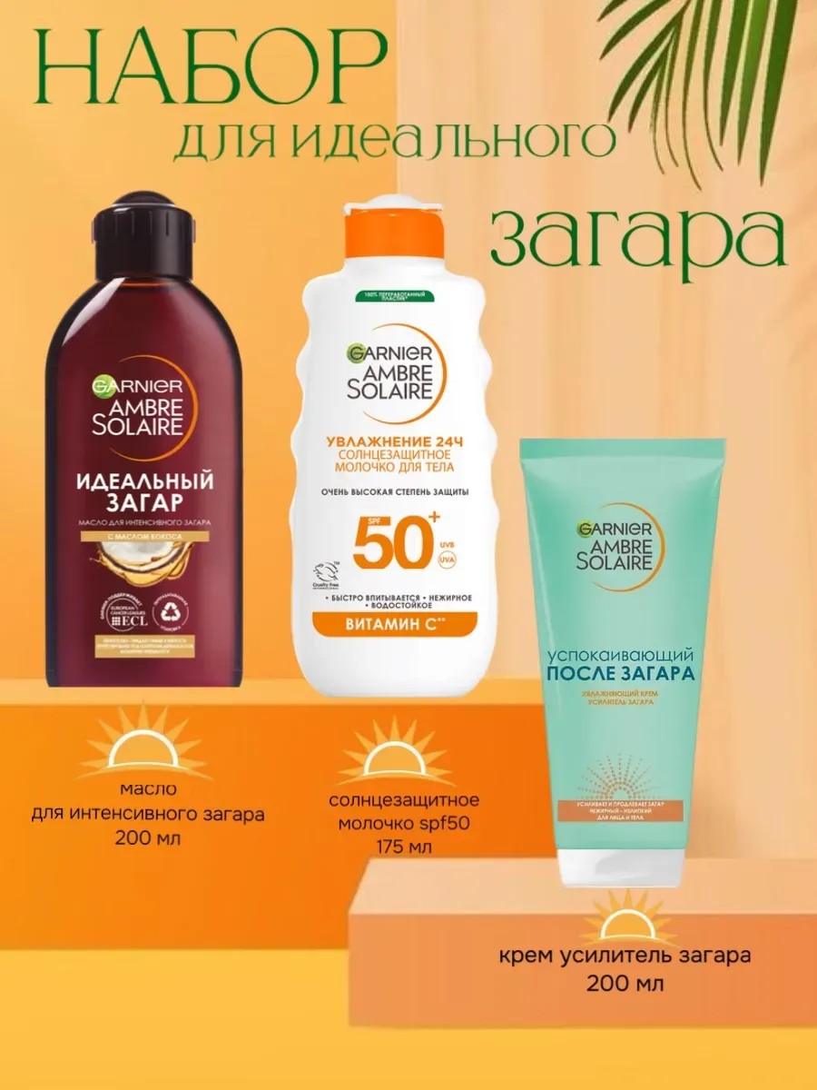 | Комплектация | масло для загара GARNIER - 1 шт; Молочко после загара - 1 шт; солнцезащитное молочко с витамином С 175 мл-1 шт |