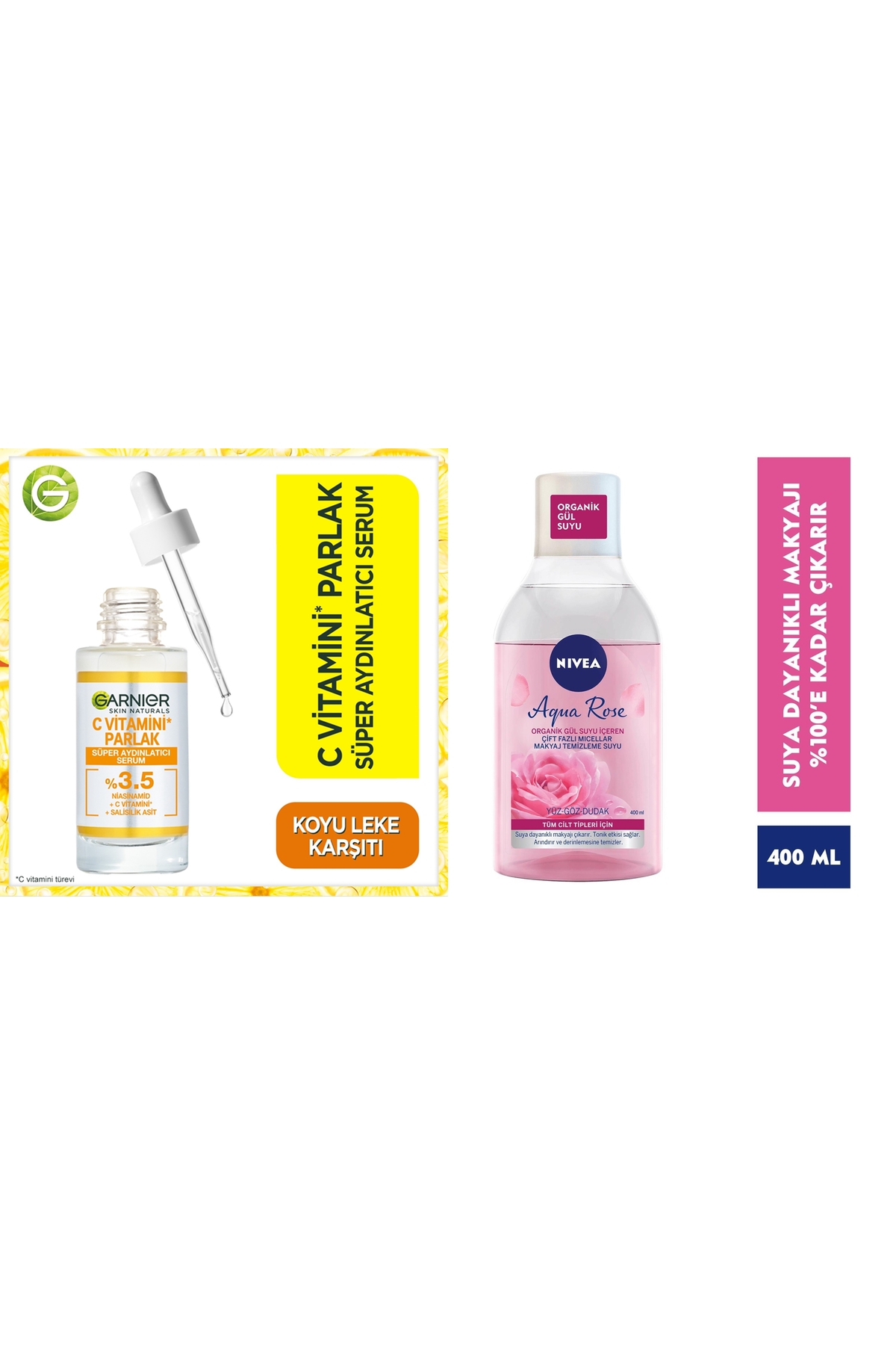Garnier Vitamin C Brightening Serum + Nivea Aqua Rose Water Dual Phase Cleansing Water 400 ml