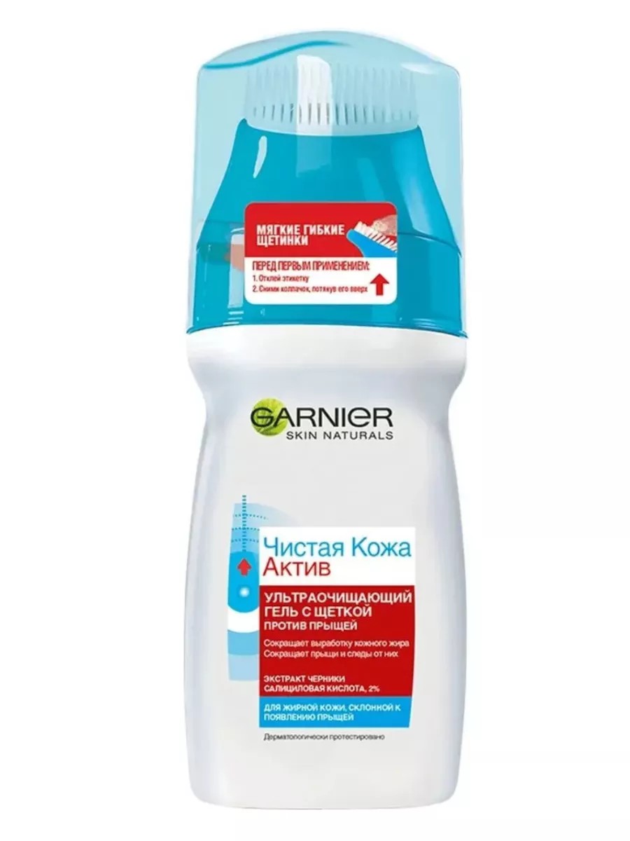 Глубоко очищает, борется с прыщами и черными точками, матирует. Гель для умывания со щеткой, предназначен специально для жирной и комбинированной кожи, склонной к появлению прыщей и черных точек. Мягкие щетинки насадки эффективно очищают поры от загрязнений, избытка кожного жира, удаляют ороговевшие клетки с поверхности эпидермиса, сокращают черные точки и следы от прыщей. Активная формула с салициловой кислотой и экстрактом черники уменьшает количество воспалений и борется с жирным блеском. День за днем кожа выглядит более ровной и свежей, поры очищены и сужены, прыщи и следы от них сокращаются. Намочите лицо. Снимите крышку и поверните насадку. Намочите щетинки и наклоните флакон вниз, слегка придавите, чтобы средство вышло. Верните насадку в исходное положение. Наносите средство круговыми движениями с помощью насадки со щетинками. Тщательно смойте.