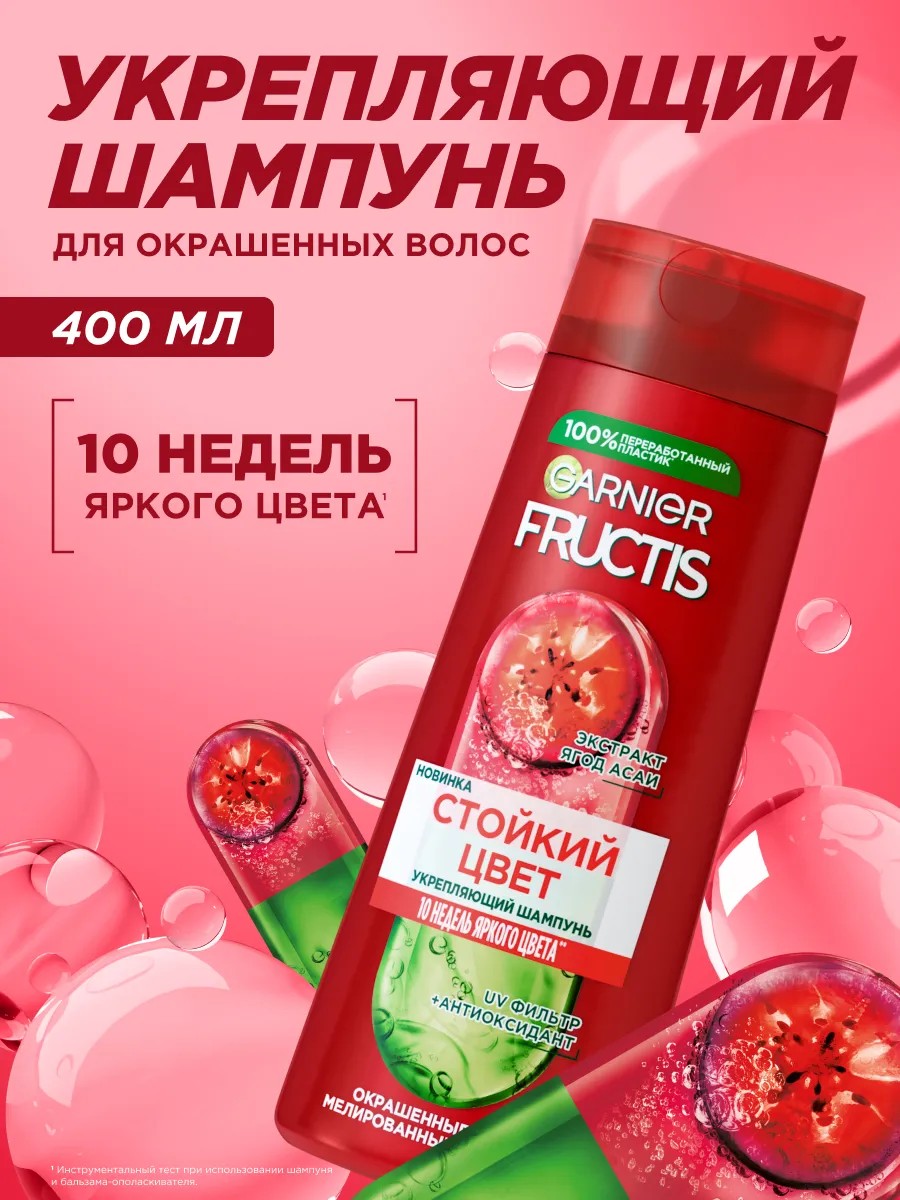 Мечтаете о ярком и стойком цвете волос, который не потускнеет после нескольких применений шампуня? Представляем Fructis Стойкий цвет — шампунь для окрашенных волос с UV*-фильтром, экстрактом ягод асаи и антиоксидантом. Средство бережно очищает волосы и обеспечивает до 10 недель яркого цвета!**