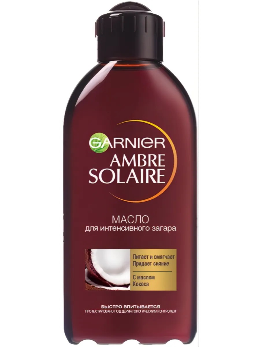 Масло для загара Garnier Ambre Solaire с ароматом кокоса, 200 мл. Garnier Ambre Solaire стремится предоставить вам надежную защиту от солнца c 1935 года. Мы также обязуемся заботиться о вашей коже с помощью нашего масло для интенсивного загара. Оно питает и смягчает кожу, одновременно придаёт ей сияние, необычайную мягкость и по-летнему приятный кокосовый аромат. Подходит для тех, кто желает приобрести более интенсивный загар. Масло для интенсивного загара, популярное среди любителей солнца, создано на основе питательной формулы и очень удобно в использовании.