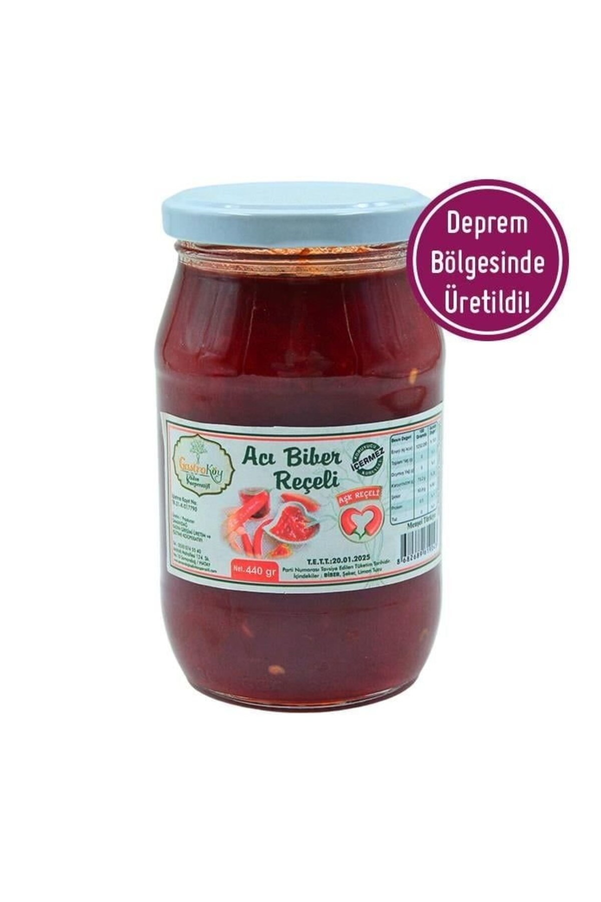 Üretim Sekli: Koruyucu ve Katki Maddesi IçermezTürü: Dogal Hatay Aci Biber ReçeliAmbalaji: Cam Kavanoz AmbalajliIsletmeci Üretici Dagitici:S.S. Samandag Kadin Girisimi Ürt.ve Isl.Koop.Isletme Kayit No: TR-31-K-017790Bu ürün Kadin Kooperatifi ve kadin emegi ile üretilmistir.Satin alarak dar gelirli kadinlarin istihdami, maddi kosullarinin iyilestirilmesi, egitim, girisim ve güçlendirme çalismalarina destek olabilirsiniz.