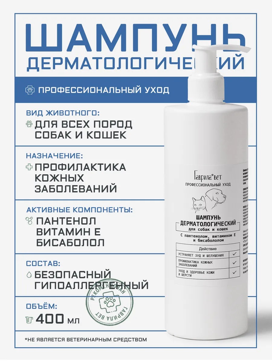 Шампунь дерматологический Гаврила Вет - это специально разработанный шампунь для профилактики и лечения заболеваний кожи и шерстяного покрова домашних животных. Активные компоненты в составе шампуня Д-пантенол, бисаболол и витамин Е способсвуют заживлению ран и трещин, ожогов. Шампунь помогает в лечении дерматитов и дерматозов, успокаивает, увлажняет и питает кожу. Укрепляет луковицы шерсти, разглаживает и восстанавливает поверхность волоса, помогает при восстановлении поврежденной шерсти.