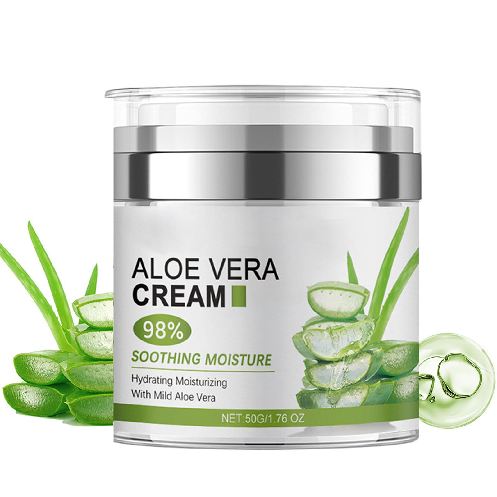 Visible Improvements After cleansing the face, take an appropriate amount of the product on the face, massage until absorbed, can be used morning and evening, after two months there are obvious changes!. Keeping Ingredients Active Unique packaging design with airless pump, reduce contact with air, to avoid oxidation, to maintain the activity of the ingredients, high efficiency to make your skin firmer. Natural Ingredients Our ingredients are all natural, do not contain artificial chemical flavors and alcohol-free, sensitive skin can also be used with confidence, will not bring any burden to your skin!. Soothing after Sun Our Aloe Vera Face Moisturizer is especially good for soothing the skin after being exposed to sunlight. It has cooling and calming properties to help reduce redness and provide sunburn relief. It effectively repairs your skin problems. Highly Concentrated Aloe Vera Extract Our Aloe Vera Soothing Cream contains 98 Aloe Vera extract , which is effective in deeply hydrating and nourshing your skin, leaving you with a glowing complexion!.